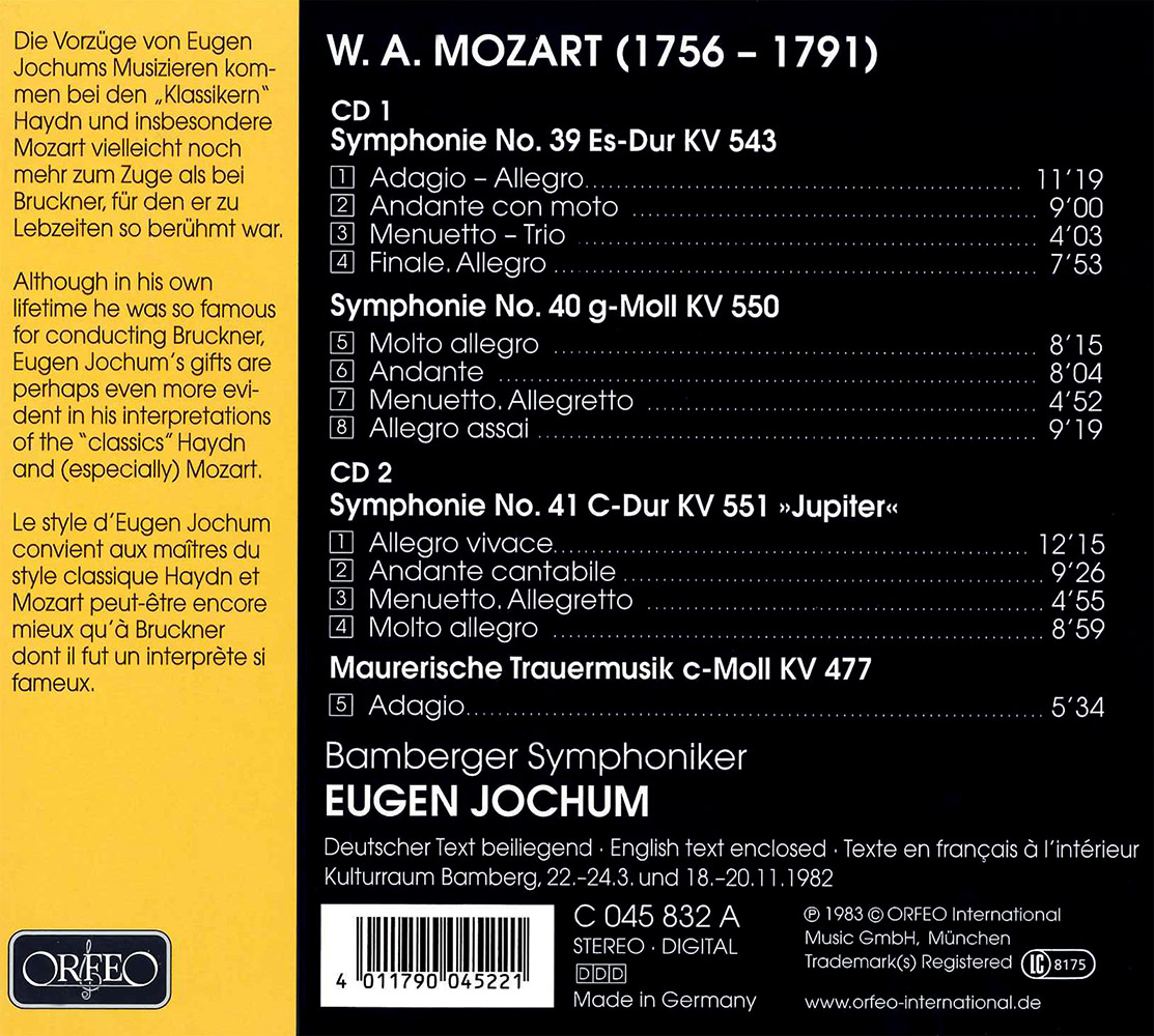 When compared to the many German conductors whose discographical archives have in recent years been rediscovered enthusiastically, Eugen Jochum has been somewhat left behind. And this is despite his having left his mark on two of the world’s leading orchestras of both his day and ours, for he was chief conductor of the Bavarian Radio Symphony Orchestra in Munich and later of the Concertgebouw Orchestra in Amsterdam. And he was furthermore one of the hand-picked group of conductors who re-founded the Bayreuth Festival in the years after the Second World War. Nor was Jochum successful just with Wagner or Bruckner, but also with contemporary works and with “classics” in the truest sense of the word. In short, his repertoire was all-encompassing. The trilogy of the last Mozart symphonies that he recorded with the Bamberg Symphony in 1982 offers eloquent testimony of his style of music-making, which had nothing trendy about it, but was timeless and captivating. Neither in his dynamics nor in his tempi did Jochum seek the extremes that some of his colleagues did. But when it came to clarity and variety of the orchestral voices and colours, Jochum was supreme. The Jupiter Symphony KV 551 is convincing in its cheerful exuberance, just as are the two previous symphonies from the year 1788. The dark colours of the G-minor Symphony KV 550 and the slow introduction of the E-flat Symphony KV 543 are played in a manner that audibly emphasizes their proximity to the music of the Magic Flute, and they remain fixed in one’s memory. This re-issue as a digipak for the price of a single CD is topped up with the rarely heard Masonic Funeral Music KV 477, which is particularly moving here – another, highly expressive late work by Mozart that was written in honour of two brethren who died in 1785. It corresponds perfectly to Jochum’s approach to the Salzburg master – serious and without any airs and graces – and it forms a fine close to this welcome re-acquaintance with Jochum’s art.