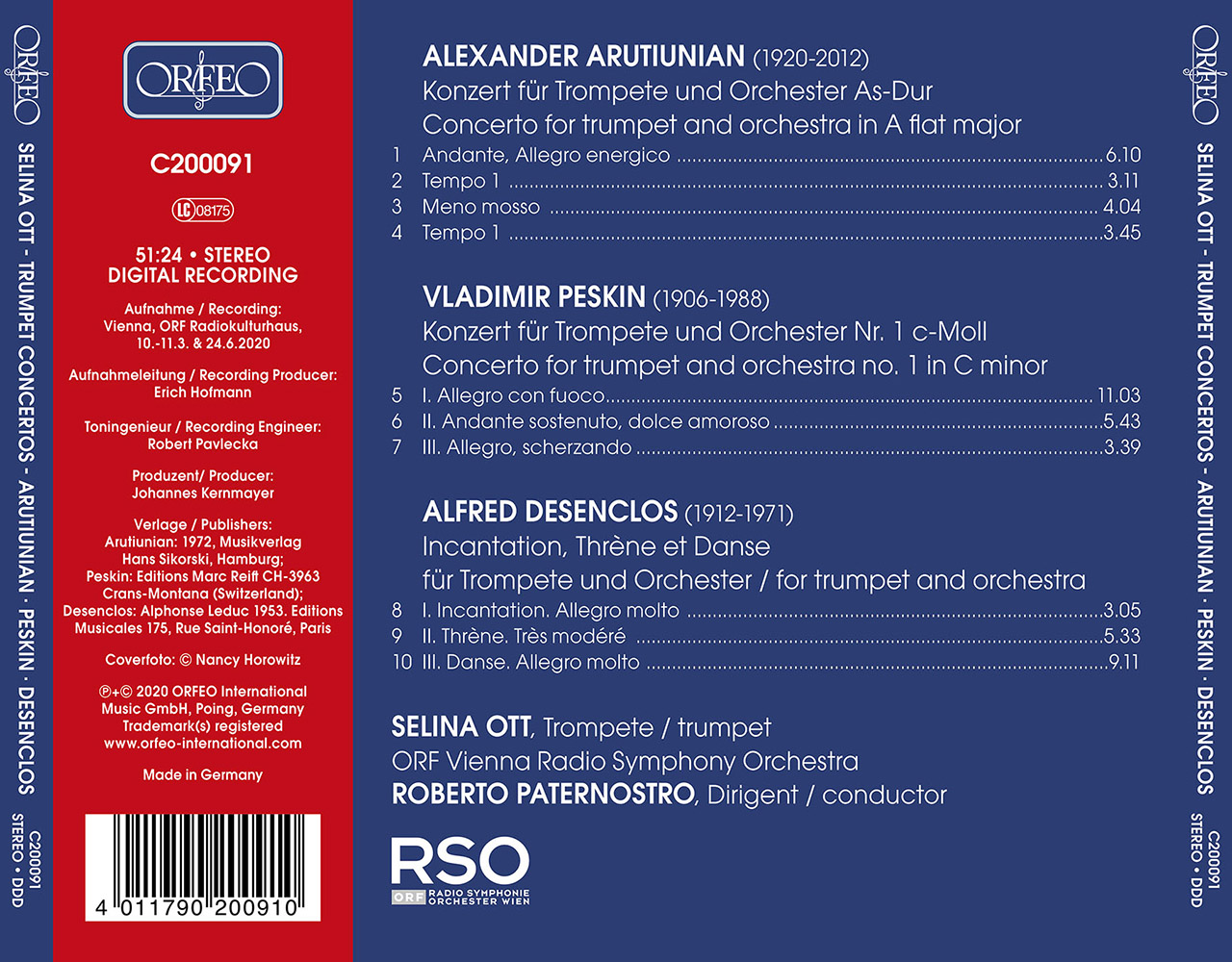 On her debut album with the ORF Vienna Radio Symphony Orchestra and Roberto Paternostro, the young artist presents an exciting selection from the opulent range of 20th century trumpet concertos that have been written in close temporal proximity to one another: the very frequently performed concerto by Arutiunian is accompanied by the much rarer first concerto by Vladimir Peskin. By exhibiting completely different facets of musical diction, the piece of the Frenchman Alfred Desenclos forms a charming contrast to these two Soviet works.