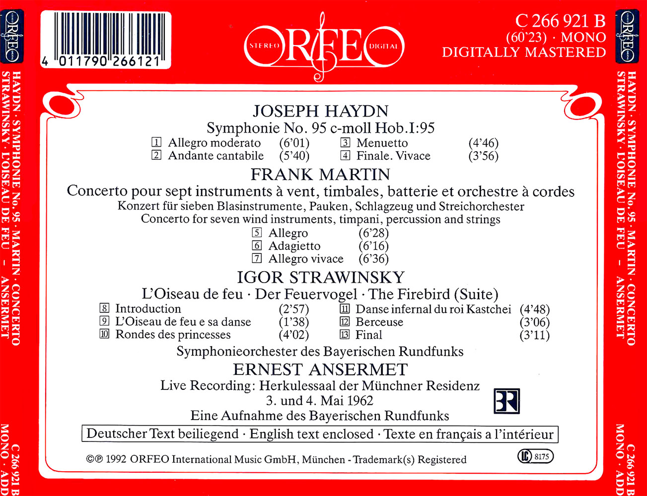 Haydn: Symphony No. 95 / Martin: Concerto / Stravinsky: The Firebird Suite - Ernest Ansermet