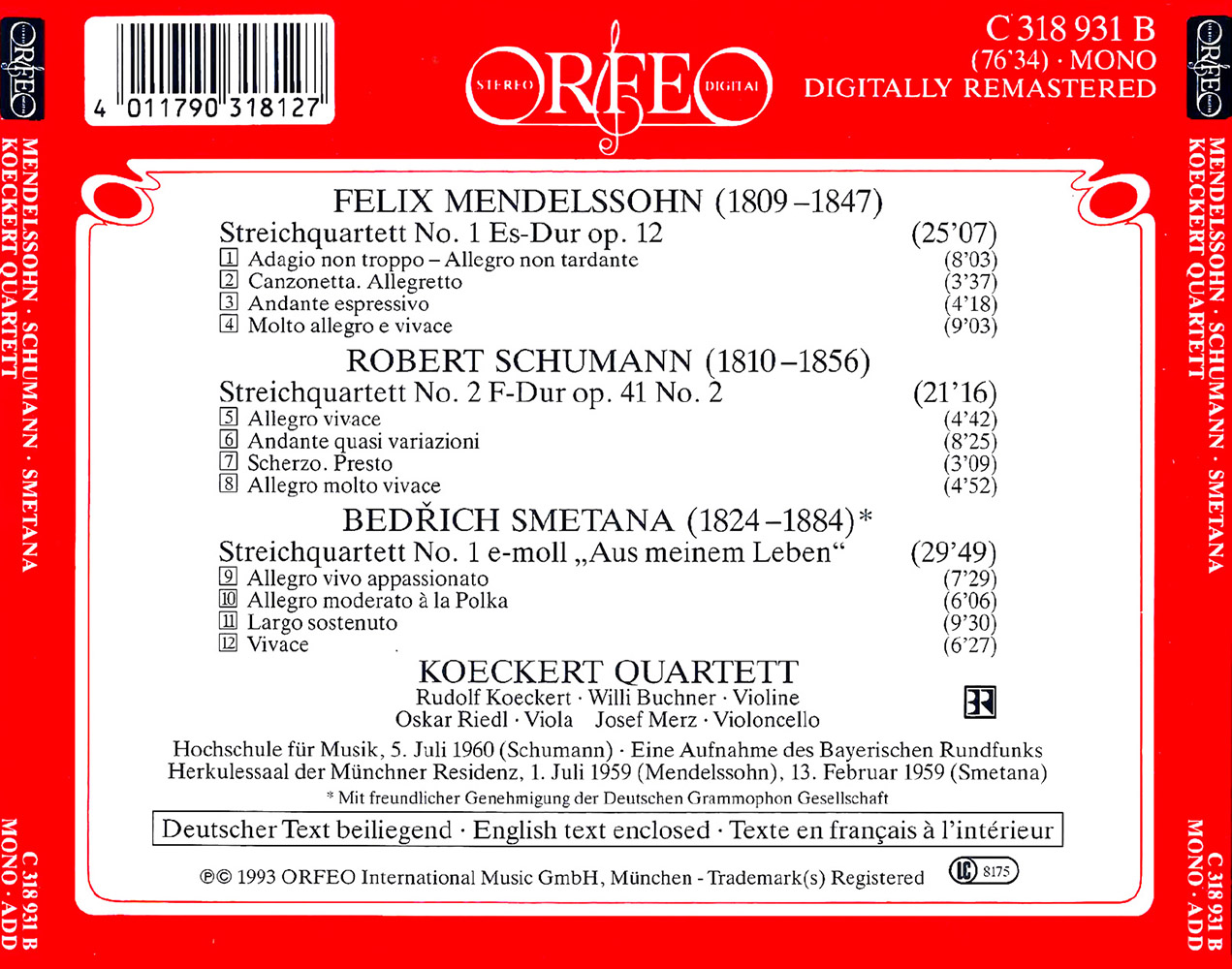 Mendelssohn: Streichquartett, Op. 12 - Schumann: Streichquartett, Op. 41, No. 2 - Smetana: Streichquartett No. 1