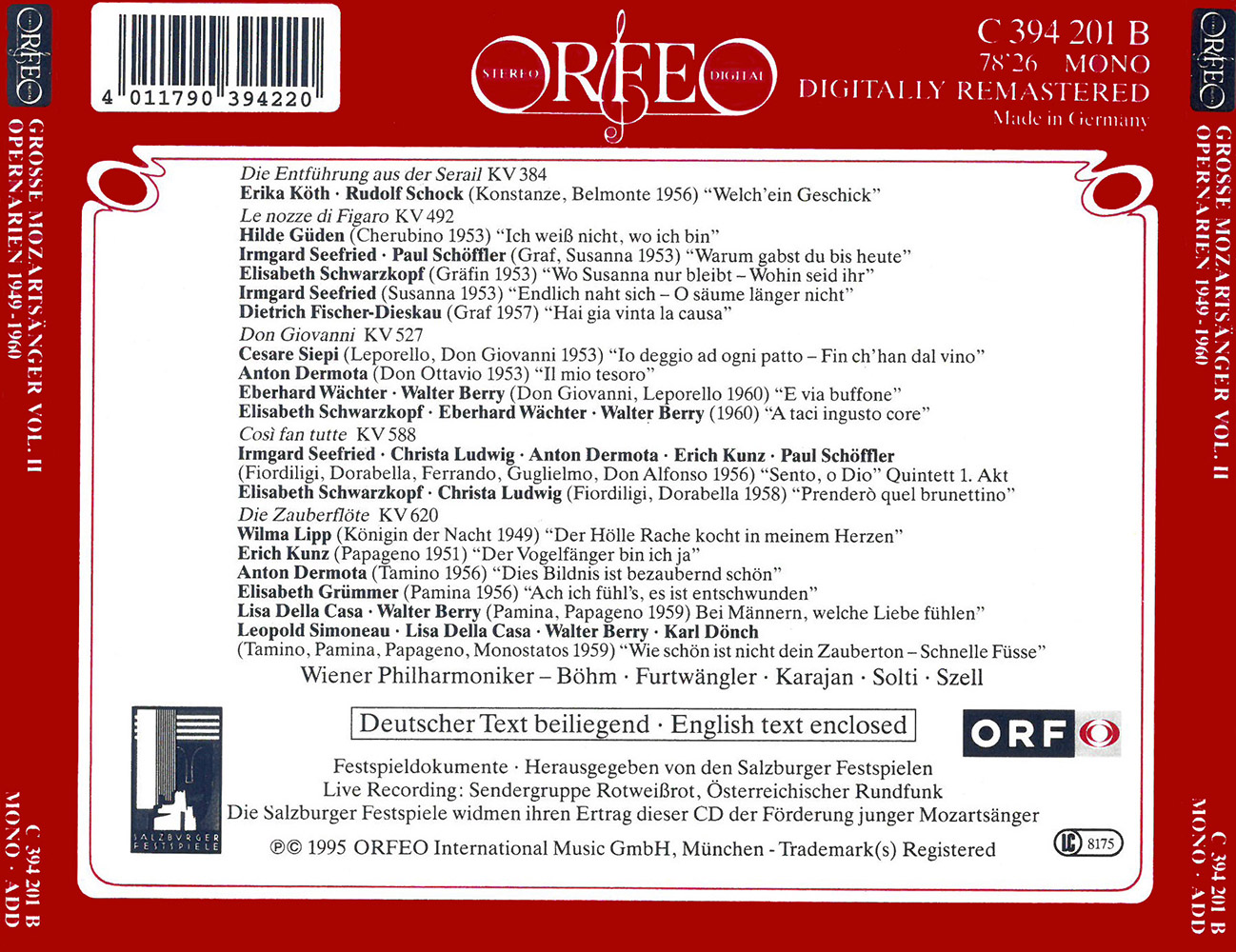 Seefried, Irmgard; Dönch, Karl; Fischer-Dieskau, Dietrich; Köth, Erika; Gueden, Hilde; Dermota, Anton; Kunz, Erich; Schwarzkopf, Elisabeth; Lipp, Wilma; Schock, Rudolf; Ludwig, Christa; Simoneau, Léopold; Grümmer, Elisabeth; Della Casa, Lisa; Wächter, Eberhard; Berry, Walter; Schöffler, Paul; Siepi, Cesare