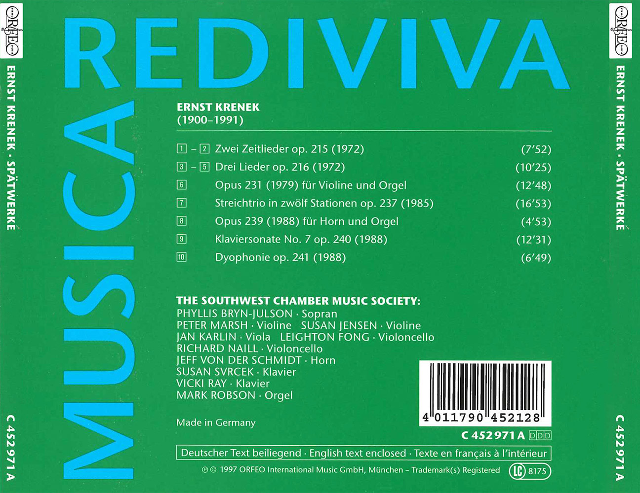 Krenek:2 Zeitlieder - 3 Songs - Sonata for Violin and Organ - String Trio in 12 Stations - Sonata for Horn and Organ - Horn Sonata - Piano Sonata No. 7 - Dyophonie