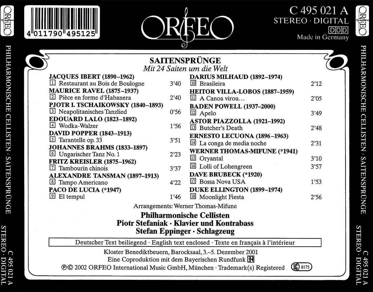 Ellington, Duke; Popper, David; Ravel, Maurice; Piazzolla, Astor; Lucia, Paco de; Brubeck, Dave; Lalo, Édouard; Thomas-Mifune, Werner; Villa-Lobos, Heitor; Lecuona, Ernesto; Tansman, Alexandre; Tchaikovsky, Pyotr Il'yich; Ibert, Jacques; Milhaud, Darius; Brahms, Johannes; Baden Powell,; Kreisler, Fritz