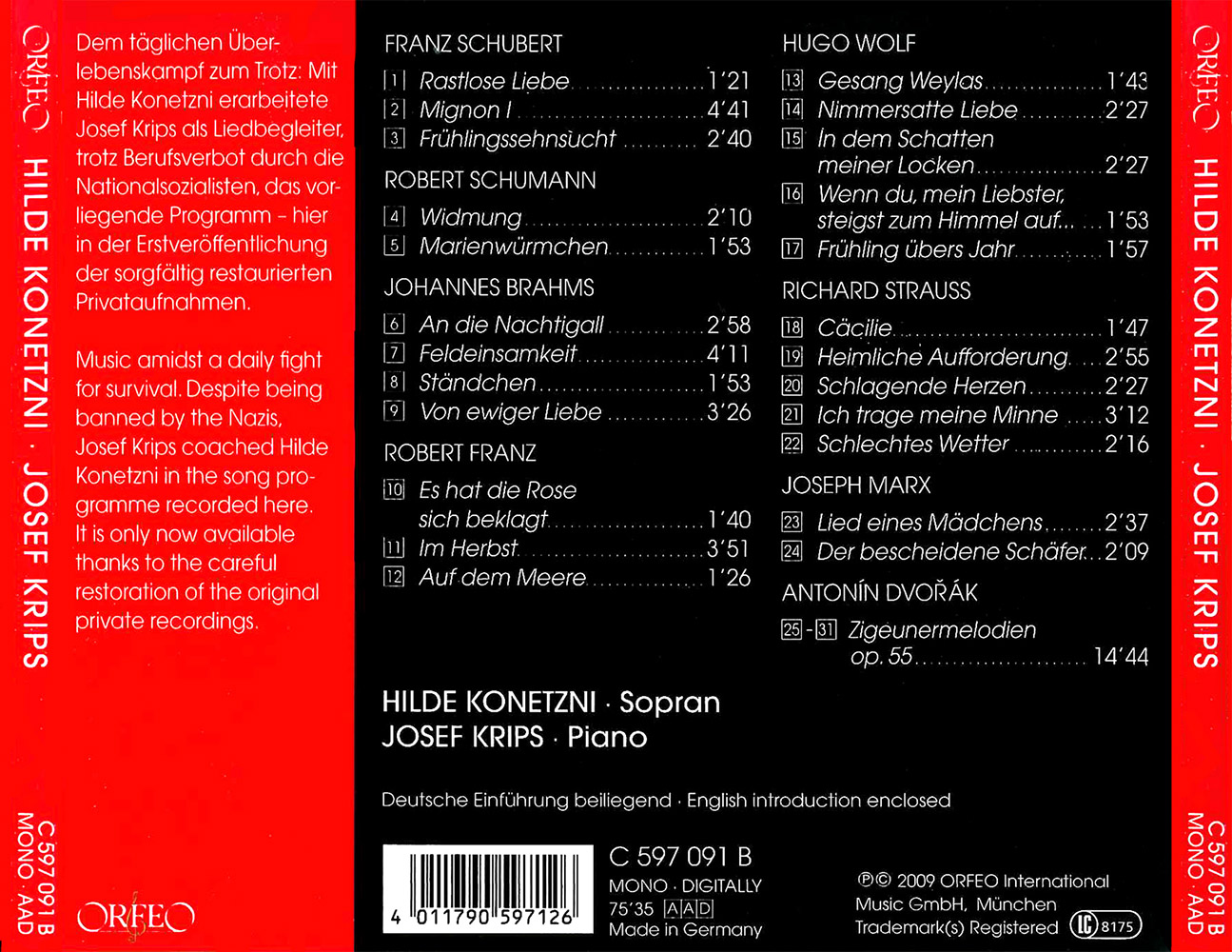 he recording conditions could hardly have been more dramatic. In the bleak mid-war winter of 1942-3, the lirico-spinto soprano Hilde Konetzni learnt a romantic song programme with Josef Krips as her accompanist and mentor (Konetzni is best known to connoisseurs as the Sieglinde in two complete recordings of the Valkyrie under Wilhelm Furtwängler). The Nazis' policies of “Aryanization” had resulted in Krips being banned from working. So his coaching activities had to be carried out “underground”, under a constant threat to his life. These private recordings were made by Hermann May, the then sound engineer of the Vienna State Opera, and can now be released on CD thanks to their careful restoration by the Eichinger recording studio in Vienna in collaboration with Gottfried Kraus. The resultant sound quality will delight more than just those interested in Josef Krips's legendary talent for carefully coaching singers - a talent that made him a model for later generations, especially as a result of the post-War Mozart performances in Vienna. One might sing Schubert and Schumann lieder with less rubato today and without the portamento usual at the time (such as we hear from Hilde Konetzni here). But all these performances are able to move us on account of the warmth and immediacy of the ensemble achieved by Konetzni and Krips. This is just as evident in the songs by lesser-known composers such as Robert Franz and Joseph Marx. And despite Konetzni's expansive timbre in all the songs, she is still able to offer a trenchant playfulness in certain of the songs by Hugo Wolf and Richard Strauss. The Gypsy Melodies by Antonín Dvorák are both the highpoint and the culmination of this recital, not just on account of the interpretative art they display, typical of the time, nor merely as a document of two artistic personalities. They are also a testament to a friendship that was sustained despite adversity, and which enjoyed a brilliant continuation in the frequent collaboration between Hilde Konetzni and Josef Krips as conductor in Viennese operatic life just after the war, when they could at last perform together in public.