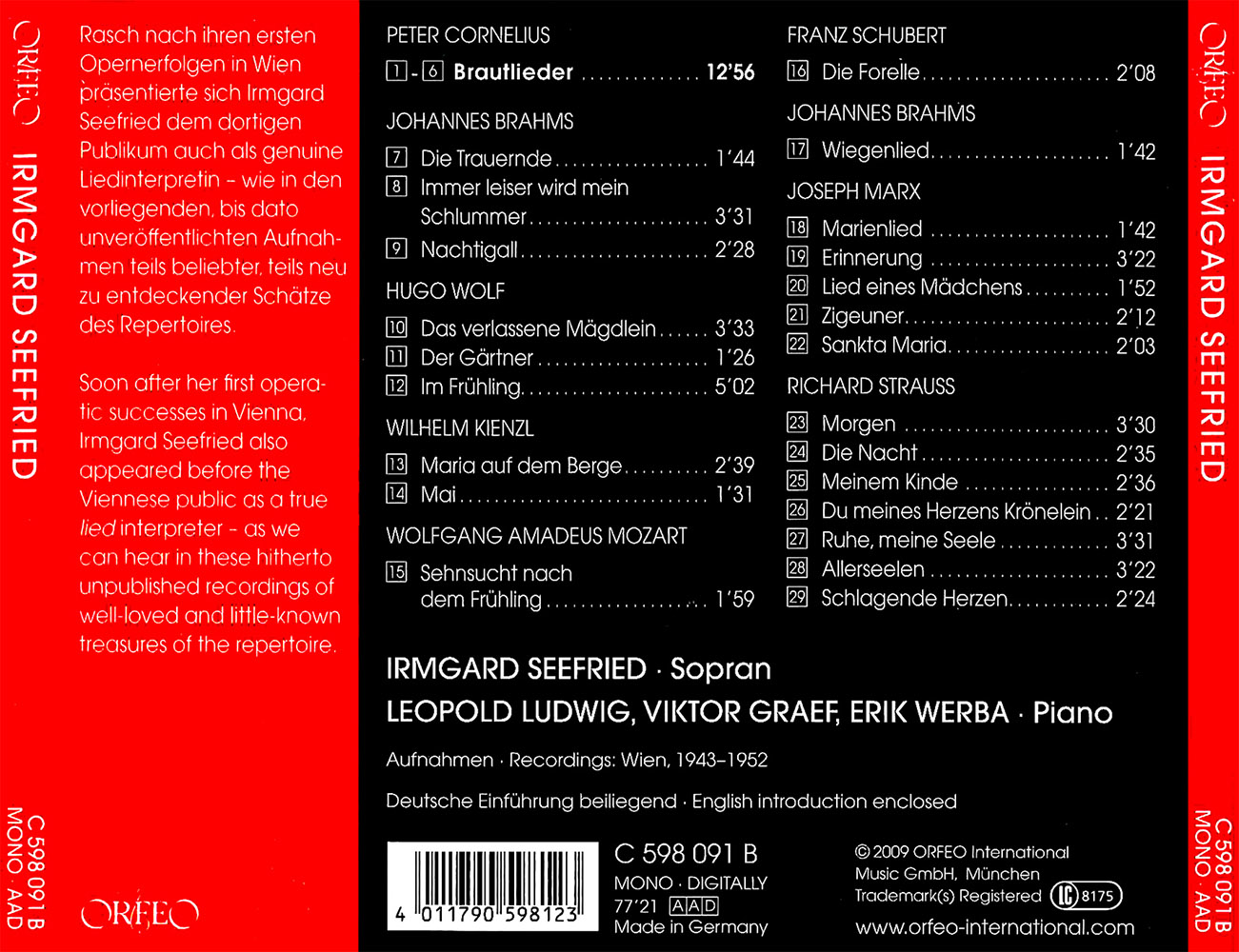 Today she would probably be marketed as an all-rounder. After all, Irmgard Seefried was not only an acclaimed opera singer whose interpretation of the Composer in Strauss’s Ariadne auf Naxos at the Vienna State Opera is said to have inspired Strauss himself to exclaim that until then he had not known how good his Composer was, but she was also a lyric soprano whose initial engagement in Aachen in 1940, at a time when Herbert von Karajan was the company’s general music director, was followed only three years later by her move to Vienna. Last but not least, she was one of the most sought-after concert singers and lieder recitalists of her age. From an early date it was above all in the intimate, miniature form of the art song that Irmgard Seefried developed her whole range of expressive colours, enjoying the chance to regale her audiences by means of a musical narrative with only her pianist as her partner onstage. Not released until now, the many recordings included in the present CD attest to the richness and variety of that palette even during the early years of her career. Her three accompanists are Viktor Graef, Leopold Ludwig, who was later to become the general music director of the Hamburg State Opera and whose fame as an opera conductor also extended to the English-speaking world, and, above all, Erik Werba. With all three, she recorded a cross-section of the song repertory ranging from some of the most famous composers to others who still await their rediscovery. The earliest of these recordings are Peter Cornelius’s Brautlieder from the heyday of the Romantic art song, settings in which the soprano’s exemplary treatment of the words and the vocal line are fully in evidence. The affinities between this cycle of six songs and the traditional German folksong offer the singer – a native of Swabia – a welcome opportunity to colour her tone even further, an approach that is also found in her recordings of songs by Mozart, Brahms, Wolf and two lesser-known composers, Wilhelm Kienzl and Joseph Marx. This compilation of Irmgard Seefried’s recordings from the first ten years of her career in Vienna additionally includes some of Strauss’s most popular songs, songs such as Morgen and Allerseelen that make it clear why, as we noted above, their composer held the soprano in such high regard.
