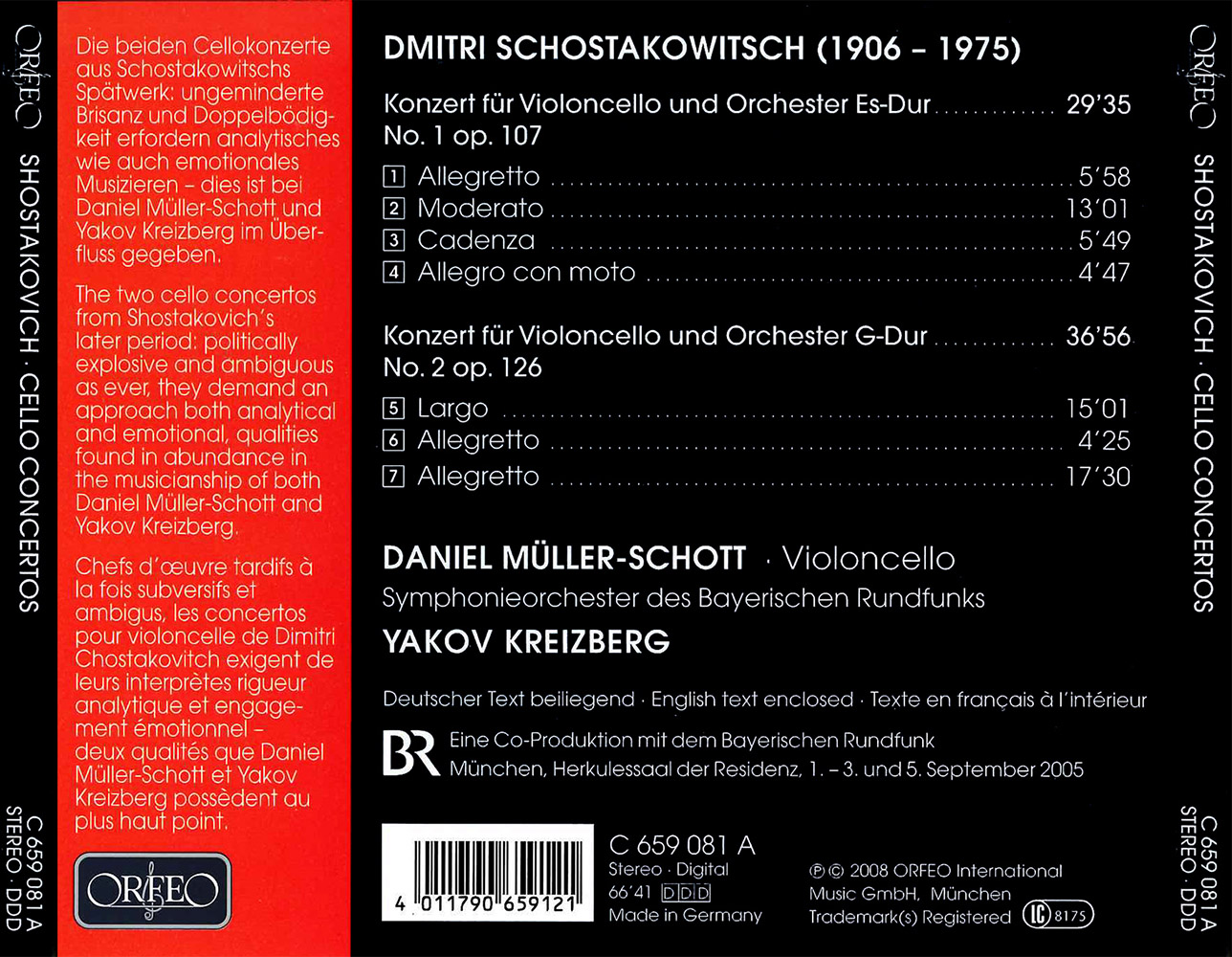 Foto: Christine SchneiderDaniel Müller-Schott has set out to explore the later works of a composer whose cryptic style represents a particular challenge for the performer, such were the political and personal circumstances of the composer’s life of suffering. As with Shostakovich’s symphonies, the cello concertos contain an undertow of constant menace culminating in blatant outbursts of the most aggressive sonorities and rhythms. Even though both the First Cello Concerto op. 107 of 1959 and the Second Cello Concerto op. 126 of 1966 were written after Stalin’s death in 1953, the threat of Soviet dictatorship and censorship continues to be palpable, as is the composer’s attempt to counter these dangers by means of encoded messages that lie between the notes. In order to convey these messages both emotionally and intellectually, Daniel Müller-Schott brings all his musical abilities and knowledge to bear on both works. More than once he allows the listener to feel the sense of heart-rending climax which according to the dedicatee and first performer of both works, Mstislav Rostropovich, the later piece in particular achieves. With the Bavarian Radio Symphony Orchestra under Yakov Kreizberg, Daniel Müller-Schott offers an exemplary interpretation of both concertos that also does justice to the peculiarities and details of their instrumentation, notably the otherworldly, Mahlerian sounds of the celesta that accompany the floating harmonics in the solo cello part in the op. 107’s opening Moderato and, more generally, in the second movement of the Second Concerto, in which Shostakovich uses a popular song from the time of the Russian Revolution to produce a grotesque dance with dissonant fanfares. No less typical of Shostakovich are the reminiscences of composers such as Mussorgsky and the set of variations in the final movement of the op. 126 Concerto, written at a time when the composer was already marked out by death, a piece described by Daniel Müller-Schott as Òperhaps the most emotionally multilayered of all cello concertosÓ, the abrupt ending of which is as disturbing as it is profoundly moving.