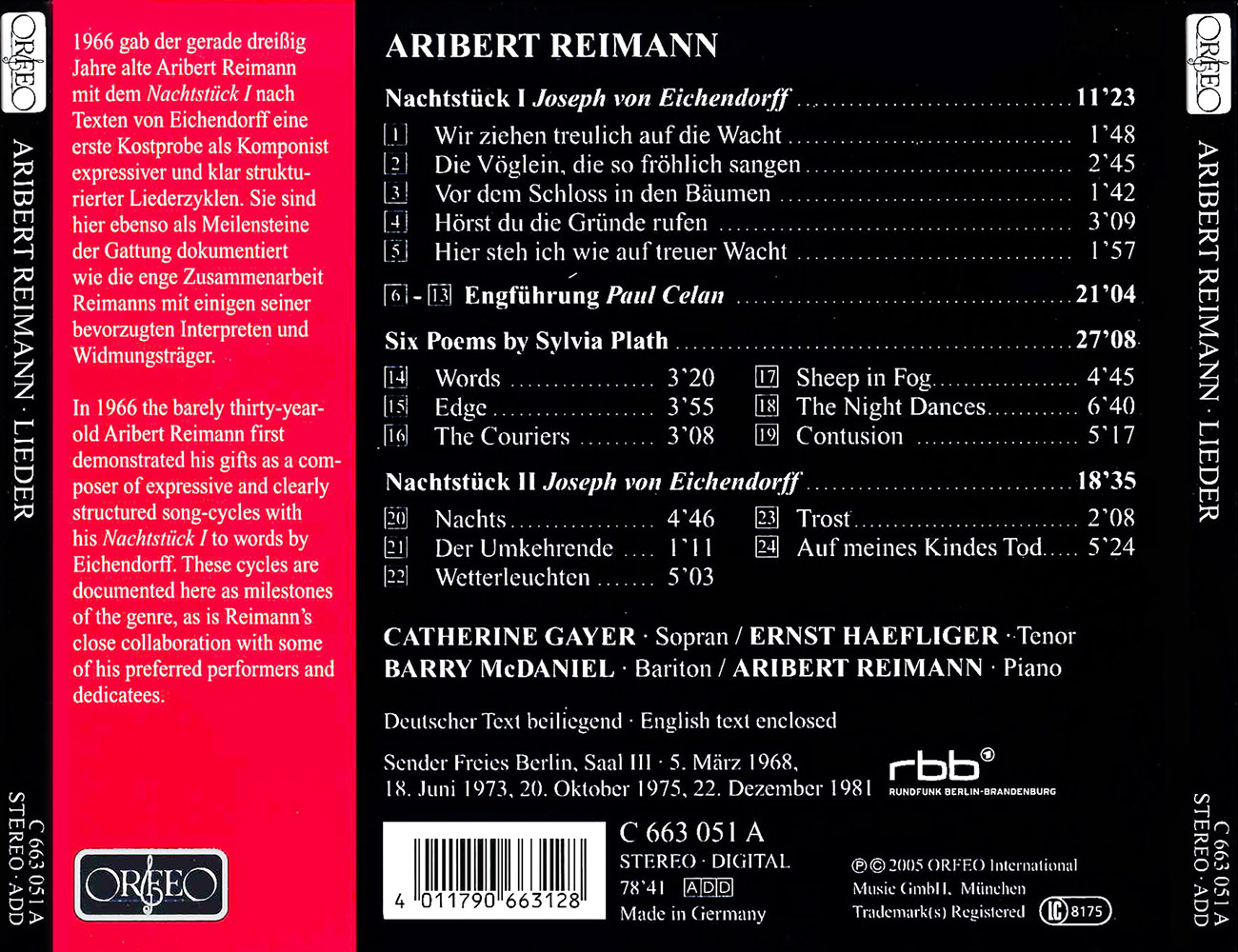 The reissue of Reimann’s early song cycles that were recorded in Berlin between 1968 and 1981 provides a preliminary answer to the hypothetical question whether and in what way it is still possible to write poetry after 1945 and, if so, how it should be set to music. Not least as a result of the different poems on which they are based, Reimann’s lieder make it perfectly plain that the musical form of the song is repeatedly reinvented and varied according to rules of its own. Although it draws its inspiration from various schools such as serial music, its self-imposed rules are repeatedly broken in the interests of musical unity, their application extended in order to achieve the greatest possible increase in expressivity. With his Nachtstücke to texts by Joseph von Eichendorff and his settings of more modern verse by Paul Celan and Sylvia Plath, Reimann has shown that the vitality of the lied as a genre rests on texts from various periods and that musical contemporaneity does not necessarily demand literary contemporaneity. Previous releases in Orfeo’s series devoted to contemporary lieder have already made this clear: think only of Hanns Eisler’s songs to poems by Matthias Claudius, Friedrich Hölderlin and Christian Morgenstern, Wolfgang Fortner’s Shakespeare Songs and Hermann Reutter’s Chamber Music to words by James Joyce, a piece which, like