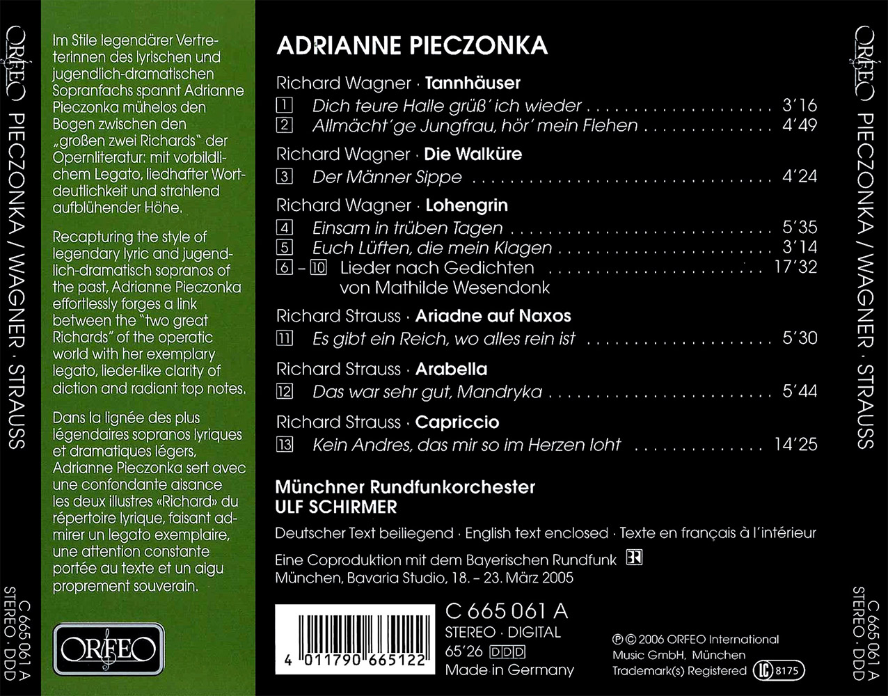 ORFEO International is now releasing a recital by Adrianne Pieczonka in a co-production with Bavarian Radio. Accompanied by the Munich Radio Orchestra under its principal conductor designate, Ulf Schirmer, it provides impressive evidence of her present pre-eminence as a lyric and jugendlich-dramatisch soprano. Like the great Wagner and Strauss singers of the past, Adrianne Pieczonka has perfect breath control, allowing her to produce a flawless line and to cultivate a seamless legato. Her interest in the lieder repertory is clear not only from Wagner’s Wesendonk Lieder but also from the fundamental clarity and intelligibility of her diction throughout the whole of the present CD. Above all, opera lovers will be delighted to hear how Adrianne Pieczonka’s voice blossoms and acquires a thrilling, ecstatic radiance at the top of her register, most notably in Elisabeth’s „Greeting to the Hall of Song“ in Tannhäuser, Sieglinde’s Narration from Act One of Die Walküre and Arabella’s final monologue from Strauss’s opera of the same name. And they will be grateful to note how fresh her voice still sounds even after nearly two decades of appearances in often heavy roles. This freshness is the result, once again, of the fact that she has planned her career astutely and carefully: she refuses to limit herself exclusively to the German repertory.