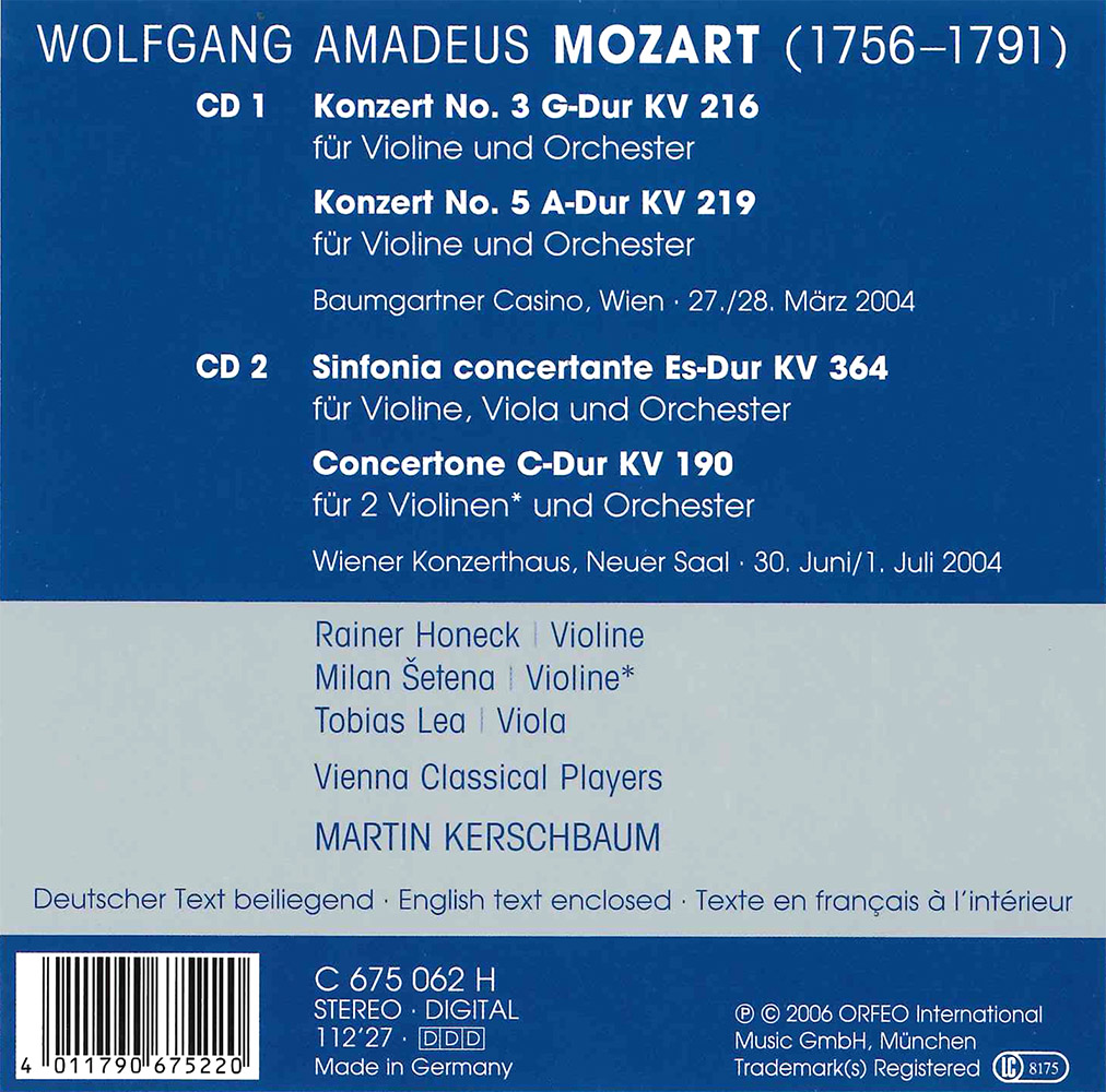 Foto: ORFEO InternationalRainer Honeck, first violinist of the Vienna State Opera and the Vienna Philharmonic Orchestra and leader of the Vienna State Opera Orchestra since 1984 and of the Vienna Philharmonic since 1992 often performs as soloist at leading centres in Europe, Japan and America. He plays on a Stradivarius violin. Milan Šetana, also member of the Vienna Philharmonic has completed his studies with Alfred Staar and has appeared all over the world at leading festivals. Tobias Lea became principal violist with the Vienna Philharmonic in 1997. The Vienna Classical Players were founded by Martin Kerschbaum in 1995 and are made up for the most part of members of the Vienna Symphony Orchestra.