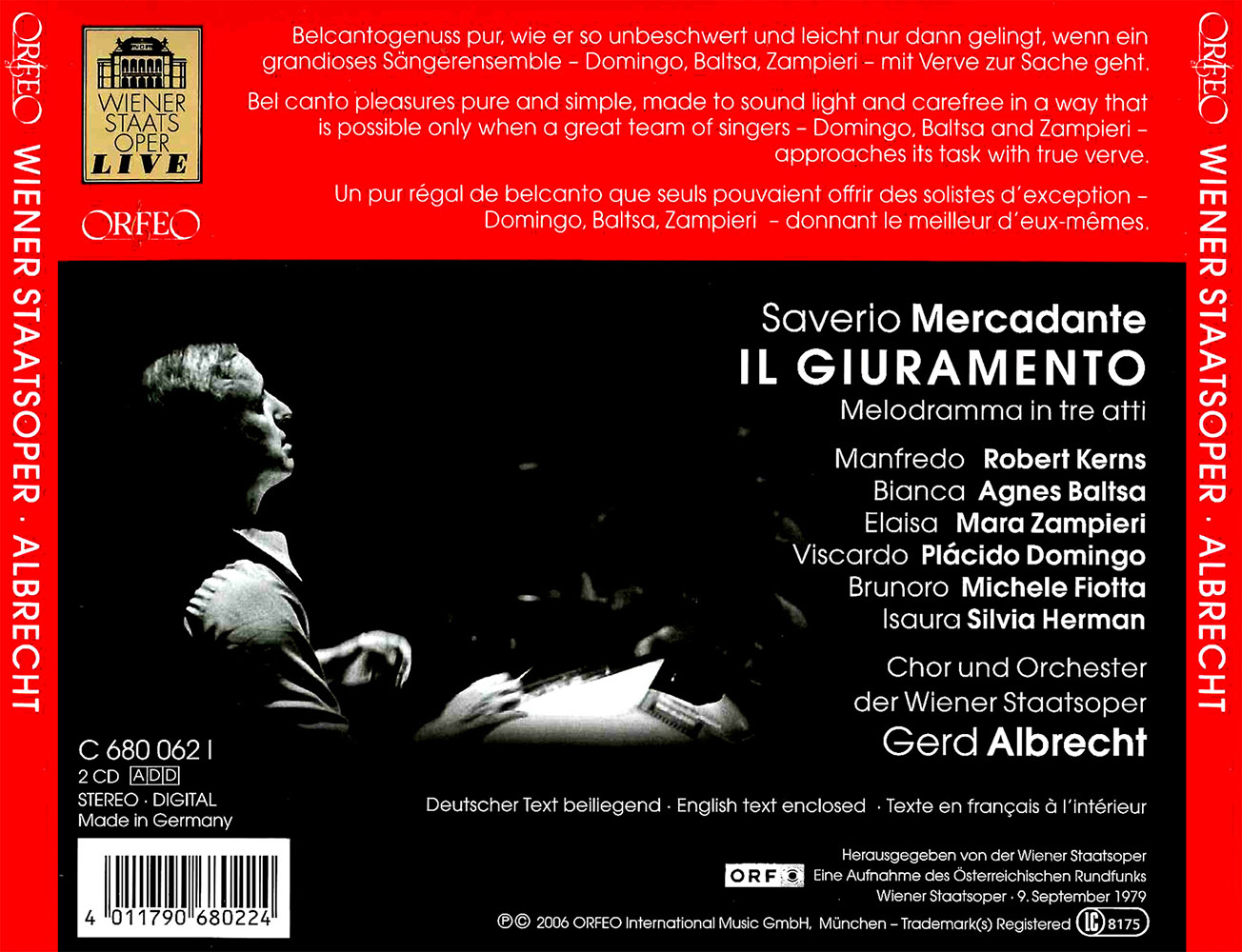 It is, of course, a commonplace that every evening in the theatre and every concert is a unique event that cannot be repeated, even though a great opera house like the Vienna State Opera may present a whole run of performances with an identical cast. n spite of this, there are performances whose exceptional nature is in no way diminished by factors that could not be taken into account when the production was being planned, but whose uniqueness is in fact increased as a result. In 1979, for example, the first of three concert performances of Saverio Mercadante’s rarely performed Il giuramento was threatened with cancellation when the tenor scheduled to sing the main role fell ill and it seemed impossible to find a replacement. In the event, Plácido Domingo sang the part flawlessly after only a day in which to learn the role, thereby underscoring what even then was the exceptional position that he has maintained in the operatic world ever since. One of his long-standing colleagues, Agnes Baltsa, likewise caused a sensation as Bianca, a show-stopping contralto role that she had already performed in Berlin five years earlier, also under Gerd Albrecht and also with Robert Kerns. The 1979 performances additionally saw the young Mara Zampieri storming the world of opera’s Olympian heights, a position she was able to maintain for many years at the Vienna State Opera, where she was especially associated with the roles of Verdi’s Odabella and Lady Macbeth and, above all, Puccini’s Tosca. Orfeo’s live recording of this altogether unique and unrepeatable performance also showcases a work that allows us to see Mercadante’s role as Verdi’s precursor in its proper light.