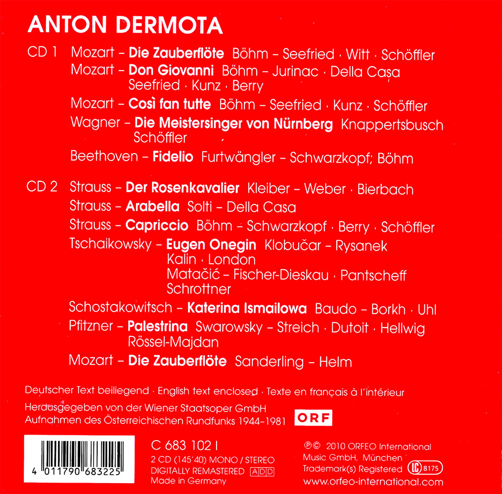 Is there anyone like him left today? And if so, where? The Slovenian tenor Anton Dermota was not just a member of the ensemble of the Vienna State Opera for over half a century. He was also a master of the stage and concert hall, celebrated all over the world from Milan to Buenos Aires. And even in his prime in Vienna he did not hesitate to put to one side his famous roles (such as Tamino in Mozart’s Magic Flute) in order to take on smaller, less thankful roles too. This new release of his performances at the Vienna State Opera makes evident this versatility. His Tamino is given here both at the beginning and the end of our selection, the one in the immediate post-war years under Karl Böhm, the other an excerpt from the run of performances under Thomas Sanderling with which Demota made his farewell to the stage in 1981, at the age of 71! Nor may Dermota’s interpretation of Ferrando in Così fan tutte and of Don Ottavio in Don Giovanni be omitted from this double CD. It is delightful to hear the contrast between roles also sung by a buffo tenor, such as David in the Meistersinger or Jaquino in Beethoven’s Fidelio, and Dermota’s exploits as a tenore lirico spinto, such as Florestan in the latter opera.