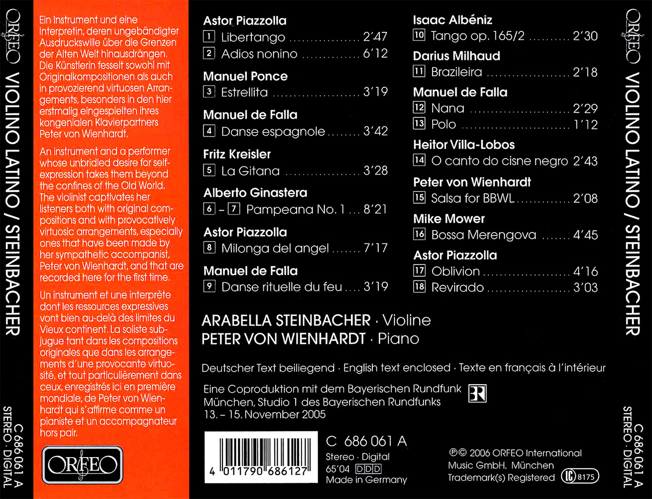 In spite of the strict rules that govern them, the rhythms of the tango, bossa nova and salsa unleash a scintillating display of virtuosity on the part of both performers. In Heitor Villa-Lobos’s O canto do cisne negro, violinist and pianist conjure up the black swan of the title from the undulating underlying motion of the music, revealing a fine ear for the atmospheric density of the writing. Impressions such as these may be found throughout this musical journey to Andalusia, Rio de Janeiro and Buenos Aires, a journey marked by the liveliest and most varied moods and ending impulsively with Piazzolla’s Revirado, in which Arabella Steinbacher prefaces the lyrical and melodious conclusion with a delightfully “?” bow-stroke.