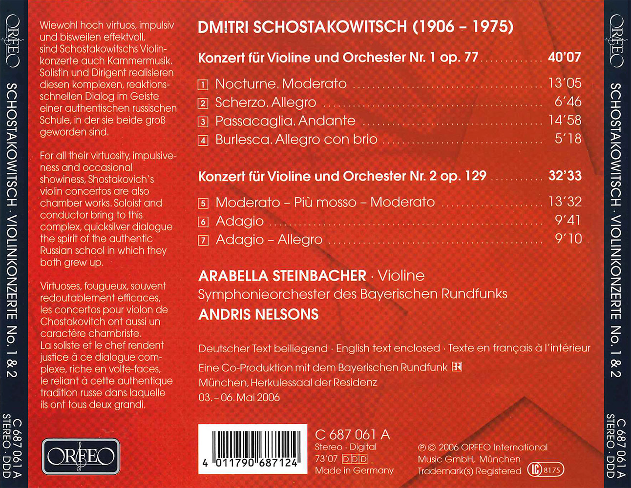 Foto: Silvia Lammertz, who had already been Arabella Steinbacher’s model in her highly acclaimed recording of the Violin Concerto of Aram Khachaturian (Orfeo C 623 041 A). In Andris Nelsons – currently both the music director of the Latvian National Opera and principal conductor of the North-West German Philharmonic – Arabella Steinbacher has found a conductor who rounded off his studies in St Petersburg, where the First Violin Concerto was first performed, and whose current mentor is his fellow Latvian conductor, Mariss Jansons, who began his own career as an assistant in the Leningrad Philharmonic – the orchestra that gave the first performance of the First Violin Concerto. Stylistically committed to an authentic Shostakovich sound, the Bavarian Radio Symphony Orchestra contributes to a recording that leaves nothing to be desired in terms of the brilliance of the music making, in which all the performers are thoroughly attuned to one another.