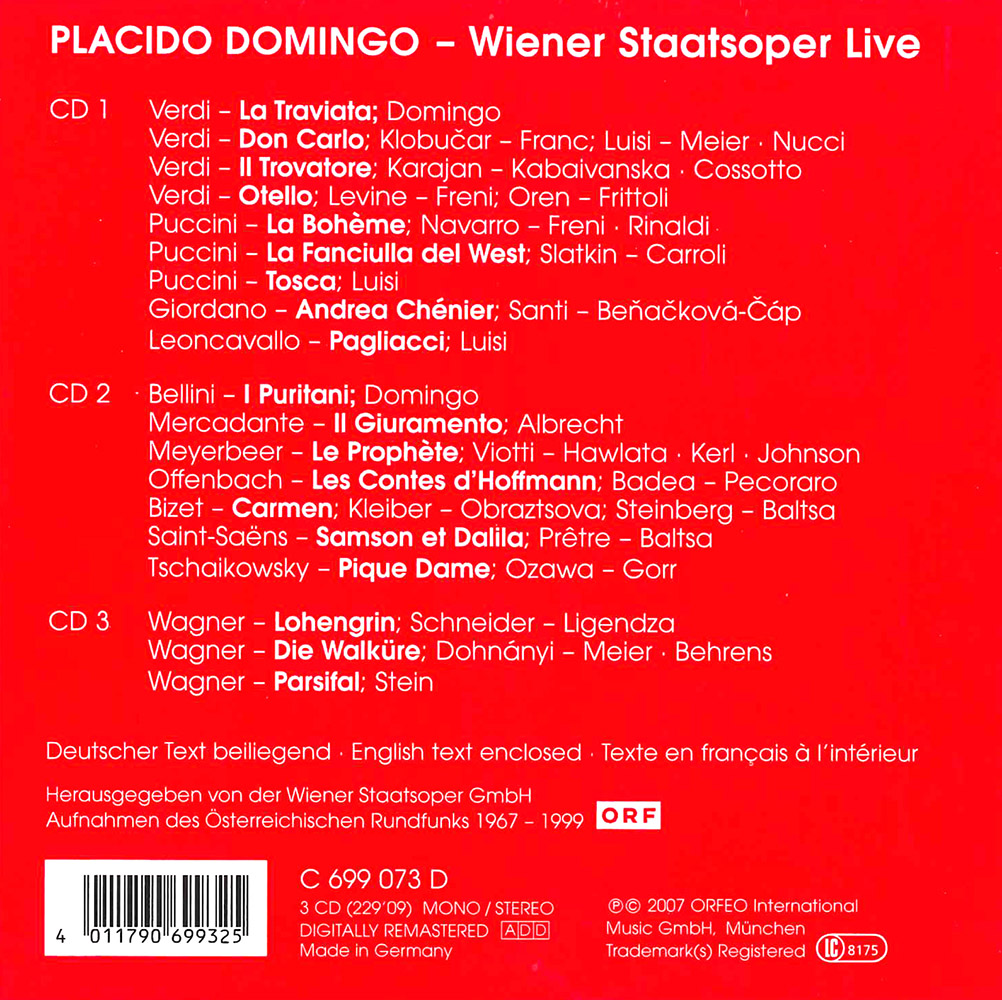 Foto: Archive of the Vienna State OperaPlácido Domingo and his standing in the international world of opera today. The fortieth anniversary of his Vienna Opera State début is a further milestone in a career that the tenor, conductor and opera house administrator continues to pursue with unflagging energy. He first appeared on the stage of the Vienna State Opera on 19 May 1967, when he sang the role of the Spanish Infante in Verdi's Don Carlo. Since then he has regularly added to his repertory in Vienna, while also choosing the house to bid farewell to some of his leading roles. Orfeo's new album of highlights from his performances at the Vienna State Opera thus includes his role débuts as Siegmund in Die Walküre and as Jean de Leyde in Meyerbeer's Le prophète as well as his farewell performances as Puccini's Rodolfo and Cavaradossi. In every one of these cases he generates the same storms of enthusiasm as those that attended virtually all his appearances in Vienna.