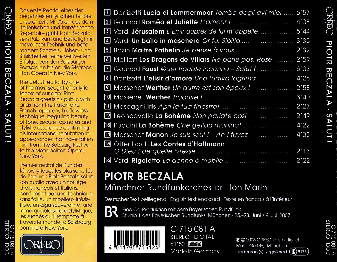 Foto: Bettina StößPiotr Beczala says “Salut” to the international record-buying public. There are no doubt many tenors who describe Fritz Wunderlich as their great model, but there can be few who stand up to the comparison with such humility and such awareness of the responsibility that it implies: he has built up his career with great care, but thanks to the abundant resources at his disposal, he has already been invited to all the world’s greatest opera houses. In 2006, for example, he was acclaimed as the Duke in Verdi’s Rigoletto at the Metropolitan Opera, New York. That same year he confirmed his reputation as an outstanding Mozartian as Don Ottavio in Don Giovanni at the Salzburg Festival. He will be returning to both these centres of musical excellence in 2008, appearing as the Prince in a new production of Dvořák’s Rusalka in Salzburg and taking the part of Edgardo in Donizetti’s Lucia di Lammermoor at the Met, alongside Diana Damrau’s Lucia. It is with an excerpt from this last-named opera that Piotr Beczala launches his début recital on the Orfeo label, a co-production with Bavarian Radio in which he is accompanied by the Munich Radio Orchestra under Ion Marin. Piotr Beczala not only sings show-stopping arias that are associated with many other great tenors and that include excerpts from Rigoletto, L’elisir d’amore and Roméo et Juliette, but he also proves himself a master of a far less familiar repertory, performing the numbers in question with the same beauty of tone and delight in interpretative detail.