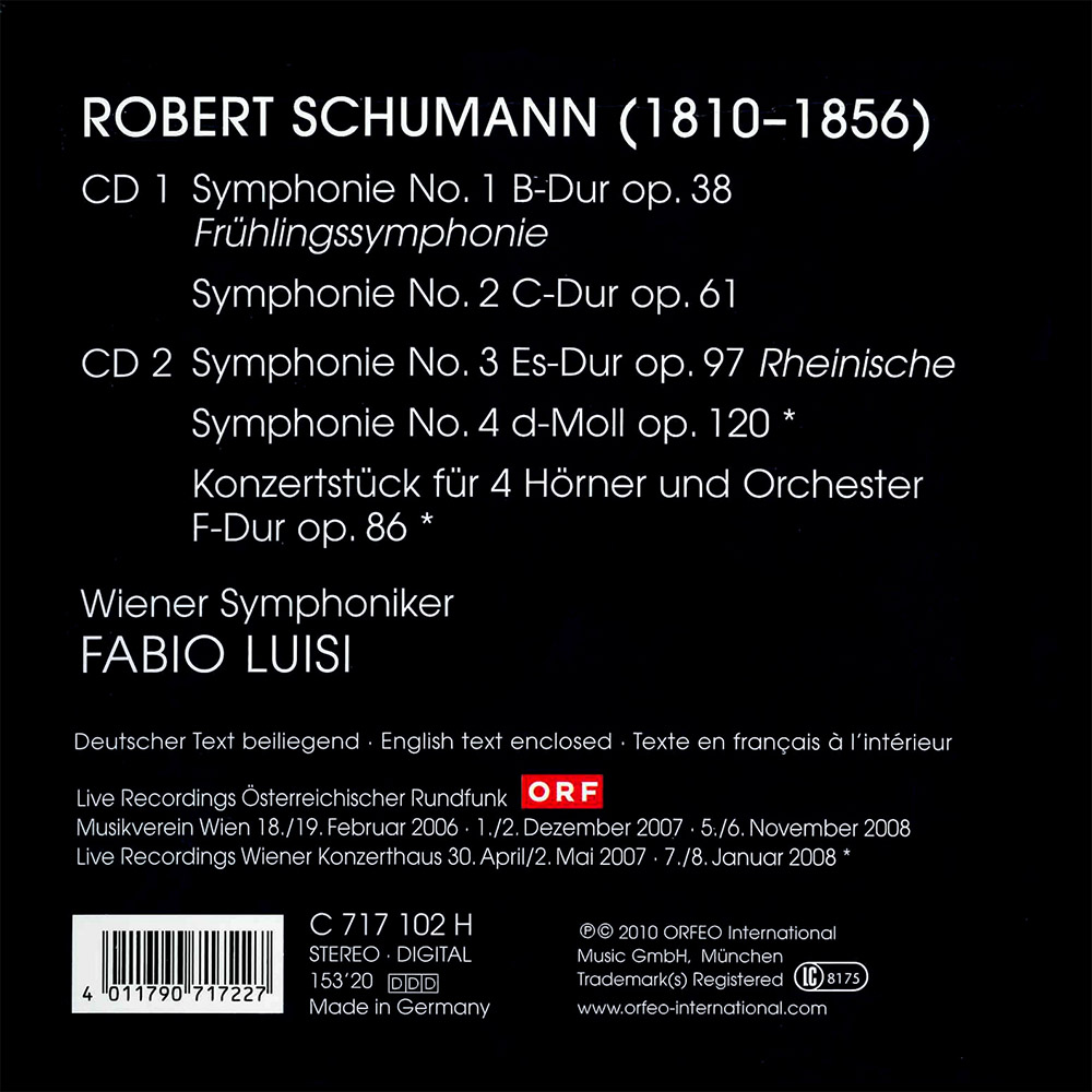 Robert Schumann the symphonist still stands in the shadow of Schumann the composer for piano and voice (the fate of Schumann the opera composer is no different). The idea that an orchestra with a great tradition of performing the Romantic repertoire should have good reason to play Schumann’s orchestral works gladly and regularly – even offering cycles of them – is something that the Vienna Symphonic Orchestra and its chief conductor Fabio Luisi have put into practice, to their credit. The conductor and his orchestra meet all the orchestral challenges that Schumann places before them. They play with the greatest of technical subtlety and beauty of tone, from the spirited First, the Spring Symphony, via the muted atmosphere of the Second, then the Third (the Rhenish) with its rich palette of moods and impressions, to the fantasy of the Fourth (which would have been the Second, were it not for the composer’s extensive revision of it). Schumann’s art of climax and the conclusive manner of his repetitions are here heard just as clearly as are his deft combinations of Romantic colours and shadings. Thus the fourth movement of the Rhenish (sometimes explained as a musical portrayal of Cologne Cathedral) is accorded the sacred tone that is appropriate to it, just as the “Romanze” in the Fourth Symphony is played as if it were a lover’s serenade. Fabio Luisi furthermore masters the tempo shifts and capricious quirks in Schumann’s fast movements. Here, the Vienna Symphonic plays with dizzying brilliance – and all is achieved “live”, without the safety net of the studio. To complement the symphonies, the present recording also includes the Konzertstück for 4 Horns op. 86, a powerful, vital work that stands in close proximity to the Rhenish symphony (not just in chronological terms), and which was composed during one of Schumann’s most productive periods. Schumann utilizes the form of the Konzertstück to explore those spaces between the “competitive” aspect inherent in a concertante work and the ensemble aspect of soloists and orchestra playing together as a symphonic ensemble. At the same time, the composer explores the possibilities of the modern valve instruments that themselves present further technical subtleties (and hurdles too). This work was long regarded as near-unplayable, but it is a matter of course that the horn players of the Vienna Symphonic here play it with complete, sovereign command.