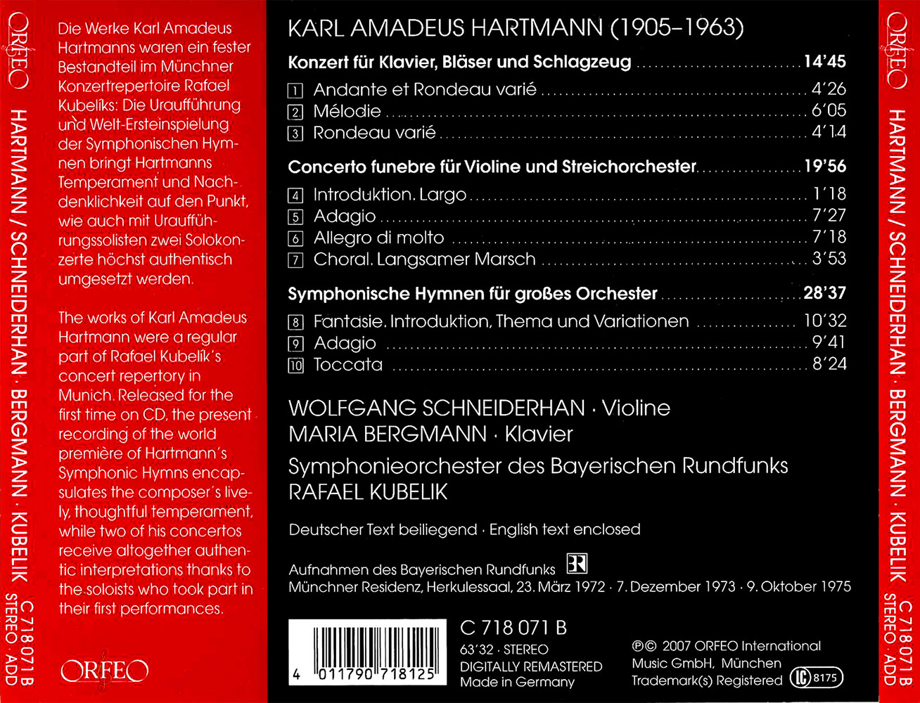 Foto: ORFEO InternationalOrfeo is now releasing three of Hartmann’s works in recordings that Kubelík made in Munich during the early to mid-seventies. The first of these three pieces is the Concerto for Piano, Wind and Percussion in which the soloist is Maria Bergmann. The performance is notable for its verve and variety and for the subtle restraint of its sustained middle section, in which the composer exploits a pronounced melodic vein. Hartmann was particularly notable for his slow movements, an aspect of his highly personal style well illustrated by the second work in this new release, the „Concerto funebre“, in which the elegiac soloist is the violinist Wolfgang Schneiderhan. Chorale-like episodes and the rhythms of a funeral march reflect the composer’s artistic engagement with the horrors of the war years, when the „Concerto funebre“ was written and first performed. The final work to be heard here is the „Symphonic Hymns for Orchestra“, a piece that dates from the composer’s period of apprenticeship with Anton von Webern and that is heard here in a world-première recording taped at the work’s first performance in 1975. This densely textured piece, often seething with outbursts of expressionist emotion, was discovered among the composer’s unpublished works when he died in 1963 and has increasingly – and deservedly – impinged on the consciousness of music lovers since the anniversary of his birth in 2005 – a good enough reason to listen once again to these pioneering, benchmark performancesunder Rafael Kubelík.
