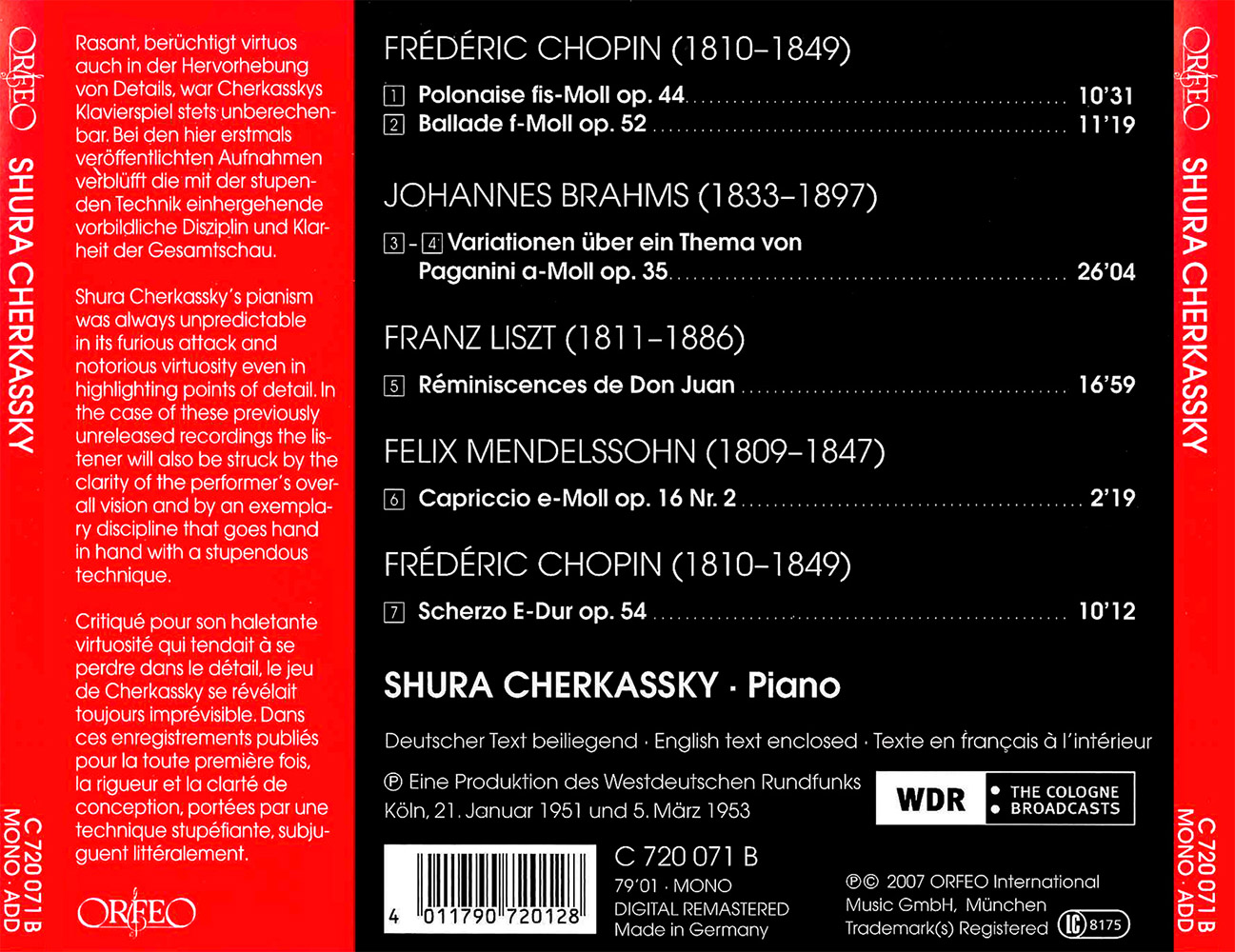 West German Radio’s reputation as one of the leading public media organizations with an active interest in classical music dates back at least to the early post-war period, when there was a constant stream of prominent instrumentalists and conductors keen to record in the old Broadcasting House in Cologne. Orfeo is pleased to launch its new series of historic recordings drawn from the archives of West German Radio with a compilation of recordings that Shura Cherkassky made in Cologne in 1951 and 1953. With virtuoso warhorses such as Liszt’s Réminiscences de Don Juan and Brahms’s Paganini Variations, Cherkassky, who was born in Odessa in the Ukraine but who later took American citizenship, confirms his reputation as an impulsive daredevil whose brilliance by no means excluded a wide range of half-colours. Also included in this new CD are scherzos by Mendelssohn and Chopin that further reveal his roguish and impish humour. Listeners who until now have thought of Cherkassky only as a circus performer fond of the wildest excesses will be surprised by the seriousness and directness of these recordings and be forced to revise their opinion of him.