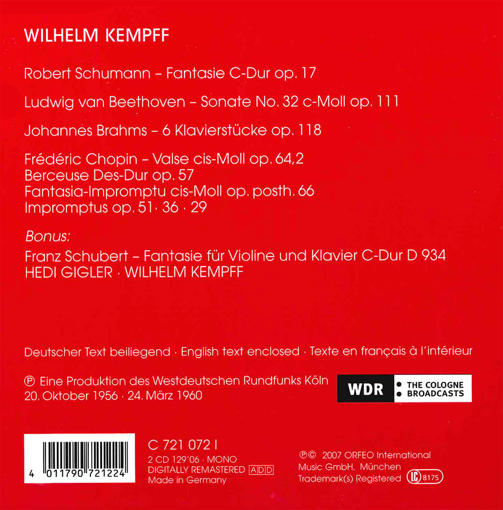 Foto: Irene Bauer-KempffWilhelm Kempff made of some of the great showpieces in his vast repertory in 1956 and 1960. All attest to the clear and meticulous playing to which his listeners were accustomed. These familiar works are supplemented by another piece that he was never again to record in front of a studio microphone and that is released here for the first time: Schubert’s Fantasia in C major for violin and piano D 934, captivatingly played by Kempff and the pianist Hedi Gigler, their performance as beautifully flowing as any song.