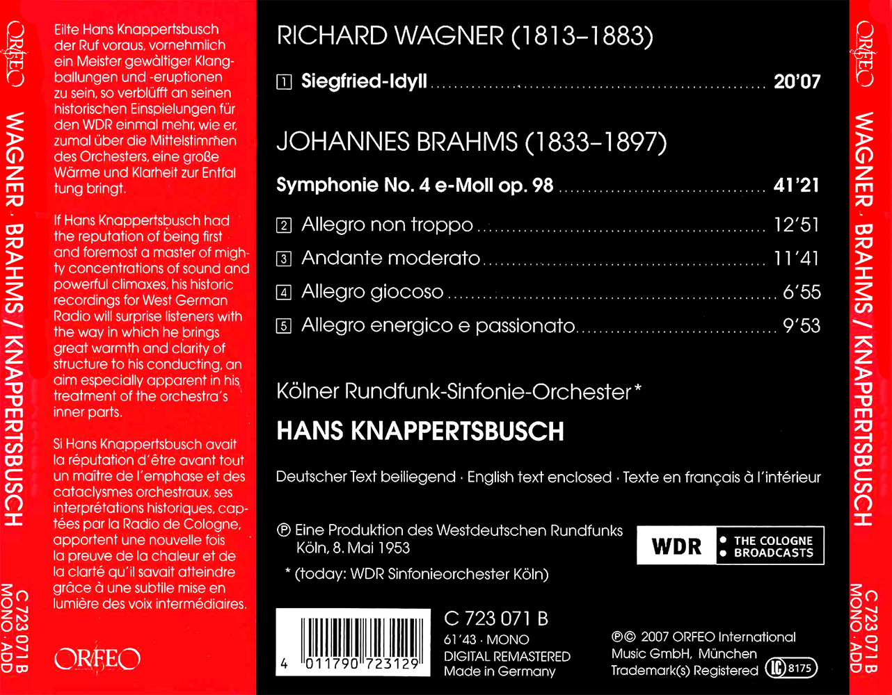 The parallel studio recording with the Cologne Radio Symphony Orchestra (now the West German Radio Symphony Orchestra of Cologne) allows today’s listeners a chance to relive this impression. No less direct and immediate is the „intoxication of creative reinterpretation“ that the same critic observed in Knappertsbusch’s performance of Brahms’s Fourth Symphony. Here the conductor makes it abundantly plain that musical tension can be produced not only by dissonances and their resolution but also from the shifting relationship between motion and stasis. After the sometimes disconcerting way in which he holds back at the beginning, making the upbeats seem halting and hesitant or unnaturally pronounced, at least by the third movement he is exploring to the full the contrasts in the dynamics and instrumentation. In the final passacaglia, the variations succeed one another in so highly elaborate a manner, before being piled on top of each other as though unwillingly, that the fatalistic ending almost seems like a gigantic pack of cards collapsing. It was moments such as these that revealed Knappertsbusch as a genuine architect on the conductor’s podium long before the champions of a more analytical approach to music-making – an approach that sometimes amounts to no more than spelling out the notes on the printed page – had laid claim to this territory. This circumstance gives a deeper meaning to a comment often attributed to Knappertsbusch by writers concerned above all to amuse their readers and which he is alleged to have made when asked why, unlike so many other maestros, he did not conduct from memory: „I know how to read music.“