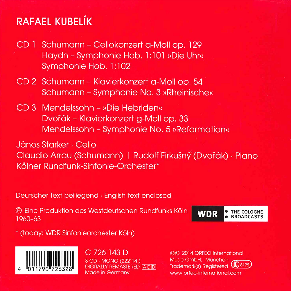 Foto: WDR ArchivBesides the recordings he made within the context of his duties as chief conductor, a series of interesting recordings also exists from the early 1960s with Kubelík conducting the Cologne Radio Symphony Orchestra (today the WDR Symphony Orchestra Cologne). The earliest of the WDR archive recordings published here is of Dvořák’s Piano Concerto. Both this composer and this work in particular played a special role in Kubelík’s career. He had performed this work in 1946 at the first Prague Spring Festival, with the same soloist as on this recording – Rudolf Firkušný. The passionate lyricism of Firkušný’s playing and the intensity of the orchestral accompaniment under Kubelík achieve such a balance that one can easily understand why the Dvořák interpretations of these two artists are regarded as exemplary to this day. The same is true of Kubelík’s interpretations of Robert Schumann, whose Third Symphony, the “Rhenish”, was accorded a definitive recording by Kubelík and the WDR Orchestra. His recordings of the Cello and Piano Concertos are of equal stature. In the former, János Starker proved an inimitable soloist with his sensitivity and love of musical detail, while in the latter, Claudio Arrau’s understanding of the musical architecture harmonised perfectly with Kubelík’s masterly sense of structure. This last quality is also apparent in his recording of Mendelssohn’s Hebrides Overture and his Fifth Symphony (the “Reformation”). Mendelssohn is a composer with whom Kubelík is seldom associated, though these performances lack for nothing in their flexibility of tempi and dynamics. And to close with, we offer recordings of two of Haydn’s London Symphonies: No. 101 “The Clock” and No. 102. Questions of authentic performance practice recede into the background when one hears Kubelík perform Haydn with such playfulness, such verve in the fast movements and such unsentimental composure in the slow movements. Like all the other treasures offered here from the WDR archives, they cast new light on the work of this conductor whose 100th birthday was on 29 June 2014.