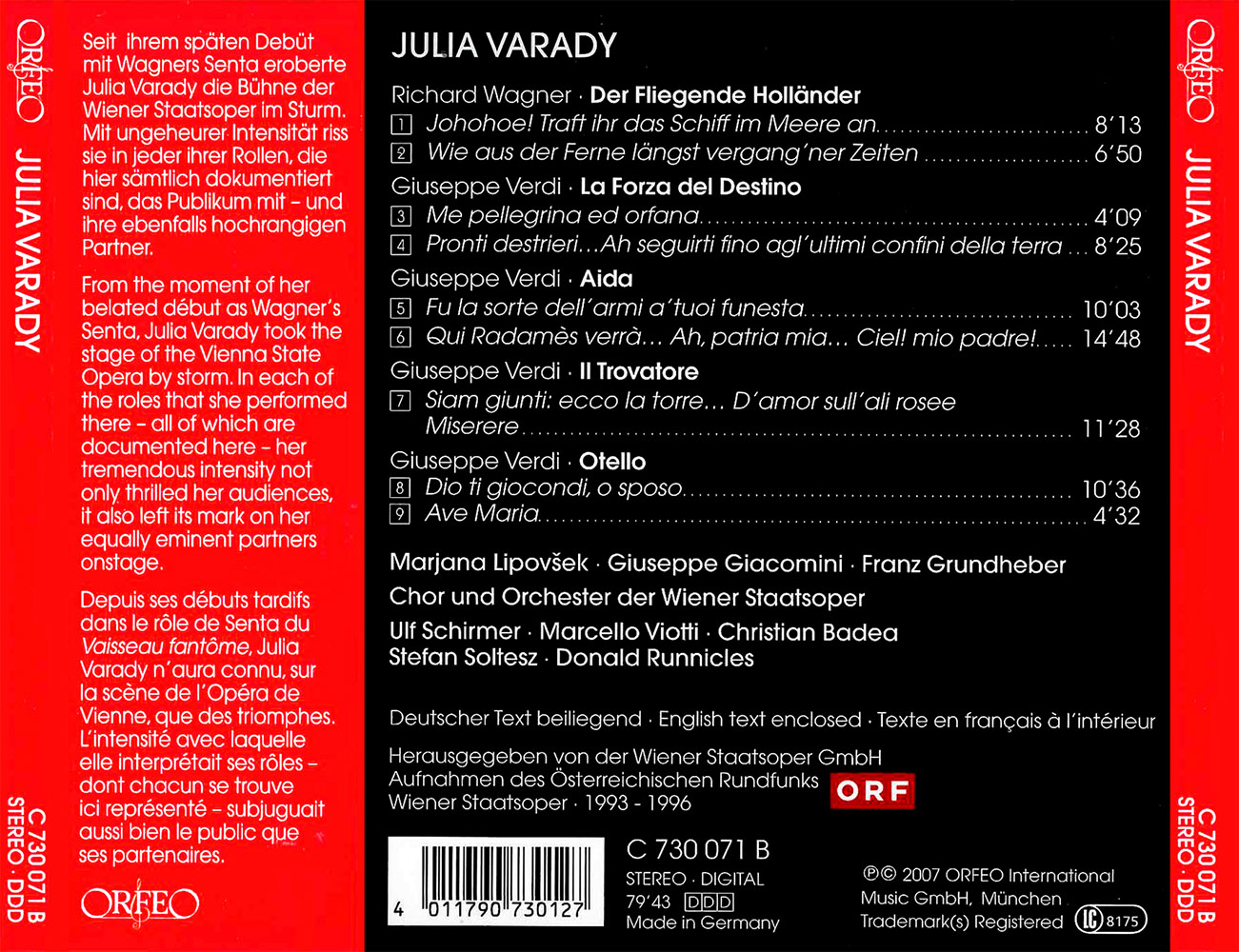 It was not until 1993 – relatively late in her career – that Julia Varady made her Vienna State Opera début with a tempestuously acclaimed performance as Senta in Wagner’s Der fliegende Holländer that allowed her to show off her greatest strengths: her immaculate voice production, her unfailing dramatic instinct and her sure sense of character. Her belated début in no way detracted from the enthusiasm and admiration of her audience on that occasion. Quite the opposite, in fact: as with all her appearances, Julia Varady’s performances remain lodged in the audience’s memory in spite of her all too early retirement from the operatic stage only three years after her first appearance in Vienna. All the roles that Julia Varady sang in the city are documented here in the form of excerpts: not only Senta but also four of the Verdi roles with which she was most closely associated: