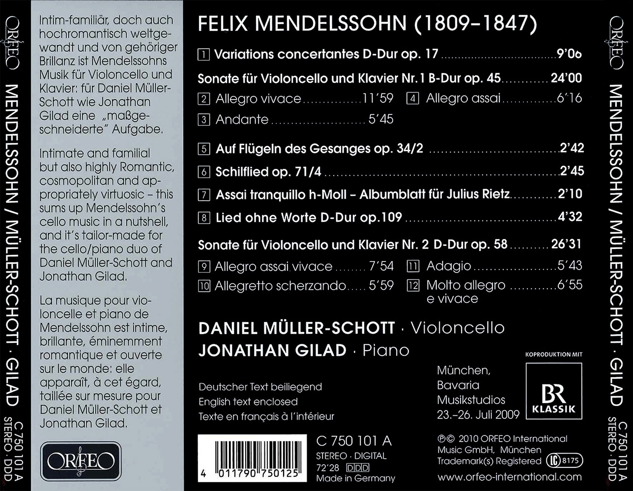 Chamber music is an intimate genre, that we know. But in the case of Felix Mendelssohn‘s cello works, it was also family-inspired. For his younger brother Paul was obviously a good cellist, and it was to him that Felix dedicated his two cello sonatas and his Variations concertantes op. 17. Daniel-Müller-Schott presents all three works here, accompanied by Jonathan Gilad at the piano. The playful virtuosity of the Variations, modelled after Mozart and Beethoven, inspires the duo to equally virtuosic brilliance, be it in the passionate eruptions in the seventh variation or the superb, subtle coda as it fades away. The First Cello Sonata is also light and airy, and the Müller-Schott/Gilad duo savour to the full its prevailingly cheerful, merry mood. The grace and passion that Mendelssohn‘s contemporaries already admired in him are here to be found throughout. In the Second Sonata, we find the most beautiful melodicism alongside moments of drama and sound colours that seem not so far removed from the world of Mendelssohn‘s Midsummer Night‘s Dream.