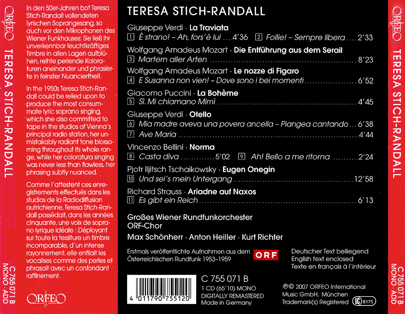 Foto: privatThe soprano’s legendary status dates back to Toscanini’s years with the NBC Symphony Orchestra, when the singer, still in her early twenties, began to conquer the world of opera. Throughout the fifties and sixties she was one of the world’s leading Mozartians, appearing in venues as diverse at the Aix-en-Provence Festival and the Metropolitan Opera, New York. In Vienna, where she was the first American singer to be awarded the title of Kammersängerin, she was not only a welcome guest singer on the stage of the State Opera, she also made regular recordings for Austrian Radio between 1953 and 1959. Together with the Vienna Radio Orchestra she recorded scenes such as the first-act finale of Verdi’s La traviata, the role in which she had made her Vienna State Opera début at the Theater an der Wien in 1952. In addition to excerpts from two of her other Mozart roles – the Countess in Le nozze di Figaro and Konstanze in Die Entführung aus dem Serail – the Austrian Radio archives also include extracts from other operas that Teresa Stich-Randall was to take into her repertory only much later (the title role in Bellini’s Norma, for example) or which she never sang onstage in Vienna (Tatyana in Tchaikovsky’s Eugene Onegin and Desdemona in Verdi’s Otello). Teresa Stich-Randall’s admirers will be delighted to discover that even in dramatic outbursts she never forces her characteristic voice, with its slight hint of fragility and a timbre so ideally suited to the roles of Verdi’s Violetta and Puccini’s Mimì. In all these recordings Teresa Stich-Randall’s singing is distinguished by the technical and interpretative qualities for which she was admired the world over: a perfect legato and phrasing that is as intelligent as it is idiosyncratic, especially in those passages that place the greatest agogic and dynamic demands on the singer. It seems entirely appropriate, therefore, that Orfeo’s compilation of Teresa Stich-Randall’s Vienna Radio recordings should end with the great monologue from Richard Strauss’s Ariadne auf Naxos: “Es gibt ein Reich, wo alles rein ist” – “There is a realm where all is pure”.