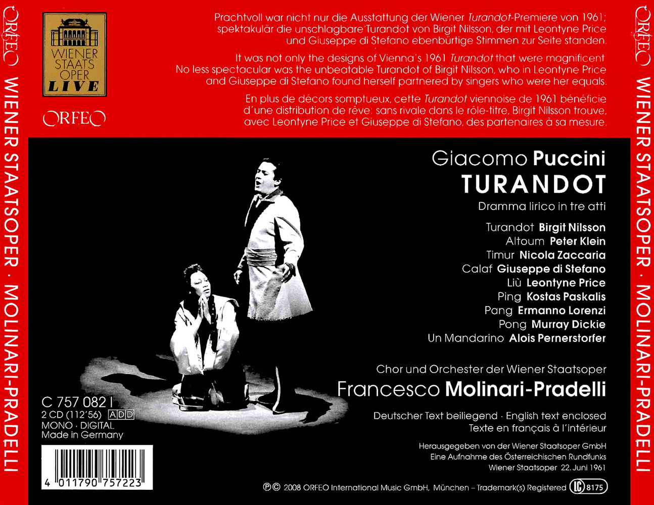They made a distinctly odd couple onstage: she was the supreme hochdramatisch soprano of her generation, a singer able to maintain her tremendous vocal powers over a period of several decades, whereas he could captivate his listeners as a poetic and spirited lyric tenor so prodigal with his resources that within a little more than a decade he had burned himself out. It was in 1961 that Birgit Nilsson appeared alongside Giuseppe di Stefano in a performance of Puccini’s Turandot which, caught on the wing by by the microphones of Austrian Radio, manages not to be simply a duel between two vocal gymnasts anxious to display their top notes. As Calaf, Giuseppe di Stefano, who died on 3 March 2008 at the age of eighty-six, genuinely gives the impression that he is able to melt the Princess of Ice with his mellifluous tenor voice and ingratiating timbre. Especially towards the end of her killer role, Nilsson shows that she has at her disposal the soft notes and subtle nuances needed to effect this change to a sense of greater humanity. This exceptional cast is completed by Leontyne Price as Liù. Rarely in the history of opera before or since have three such distinguished singers appeared together onstage. Price’s portrayal of the self-sacrificial slave-girl is wholly convincing, even though only its vocal element is preserved in the present recording, which dates from the days when Herbert von Karajan was director of the Vienna State Opera and reflects the international lustre of his casting policy. This new production of Turandot was conducted by Francesco Molinari-Pradelli, at that time one of the most sought-after conductors of the Italian repertory. Together with the chorus and orchestra of the Vienna State Opera he offers a reading of Puccini’s colourful score that has real weight to it, sometimes rising to climaxes that sound positively threatening. At the same time, however, the lyrical element, including the arioso passages for Liù and the famous aria „Nessun dorma“, are underpinned by the Viennese strings in a way which – as we might expect – could hardly be more beautiful. An evening in the opera house at which so many of the favourable conditions that we associate with a resident company were combined with the unique and distinctive personalities of international soloists turned out to be a rare success, making it all the more gratifying that we are at least able to hear it again – and again.
