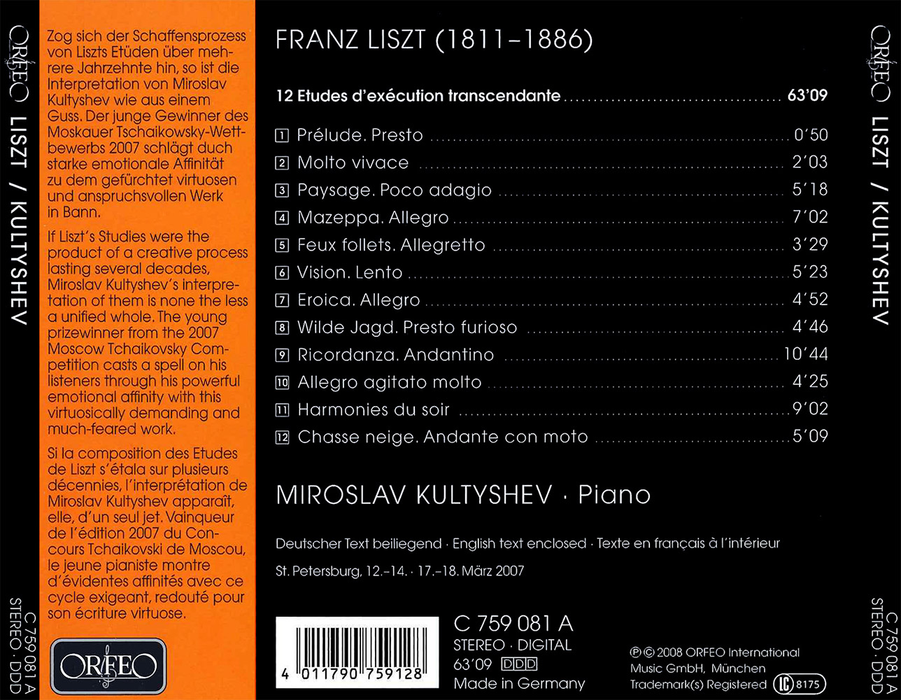 The Russian pianist Miroslav Kultyshev was still a child when he discovered his altogether exceptional gifts as a musician. Not yet in his mid-twenties, he is now a regular visitor to all the world’s major concert halls. The holder of scholarships from the Yuri Bashmet Foundation and the St Petersburg Philharmonic Society, among others, he has already appeared in the Großer Saal of the Vienna Musikverein, the Amsterdam Concertgebouw and New York’s Avery Fisher Hall. He has worked especially closely with the conductor Valery Gergiev, and the two have appeared together in numerous halls and at several festivals. For Orfeo he has recorded Franz Liszt’s quintessentially Romantic Études d’exécution transcendante, a cycle of twelve piano pieces that is arguably the most technically difficult of all such cycles as well as being the most challenging from a purely musical point of view. The result is striking and instantly infectious: Kultyshev is one of those hand-picked pianists who are not only capable of unleashing the full force of Liszt’s ensorcellments without apparent difficulty but who are also able to fill the work to the very brim with passion and life. This is due in part to Kultyshev’s ability to phrase even the most demanding passages and climaxes organically, be they chordal or polyphonic, be they wide-ranging intervals or breakneck runs: not for a moment does he slow down randomly to compensate for technical deficiencies, but nor does he speed up in pursuit of empty effects. But it is also due to the fact that Kultyshev is already a past master at mixing Romantic tone colours, notably in the second study in A minor (“a capriccio”), with its radiant upper voice in the treble and accompanying chords far below it. In Mazeppa he is able to integrate the motif of the revolutionary song into the furious basic movement, giving it its proper weight and ultimately bringing to it a very real sense of triumph, whereas the major-key variant in the middle section is beautifully understated in its cantabilità. But however much artifice may lie behind these magisterial performances and however sensitive Kultyshev’s musicality may be, his interpretation surprises us and appeals to us with rare immediacy because he is so clearly in total command of his instrument and intellectually imbued with the whole cycle and, above all, because of his resultant emotional and, indeed, impassioned identification with all twelve of these pieces. There is something almost terrifying about this identification, and in so young an artist it is certainly astonishing. In general, Kultyshev seems altogether predestined to succeed most of all with the atmospherically dense impressions of nature that Liszt has included in these studies, from Feux follets, the iridescent chromaticisms of which are fully in keeping with the piece’s title, to the darkly sonorous glow of Harmonies du soir and, finally, to the evocative, wintry landscape of Chasseneige, which brings this set of twelve transcendental studies to its atmospheric conclusion.
