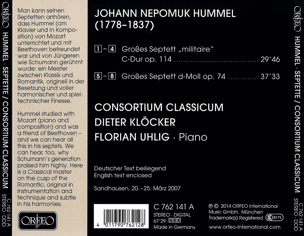 For several decades now, the Consortium Classicum has been recognized as one of the outstanding chamber ensembles with a variable formation. This is proven once again by the present recording of piano septets by Johann Nepomuk Hummel (1778–1837), in which the founder of the Consortium Classicum, Dieter Klöcker, participated before his death in 2011. The pianist in each of the septets is Florian Uhlig. It should not surprise us that combinations of seven instruments should have inspired the imagination of so many composers after Beethoven.