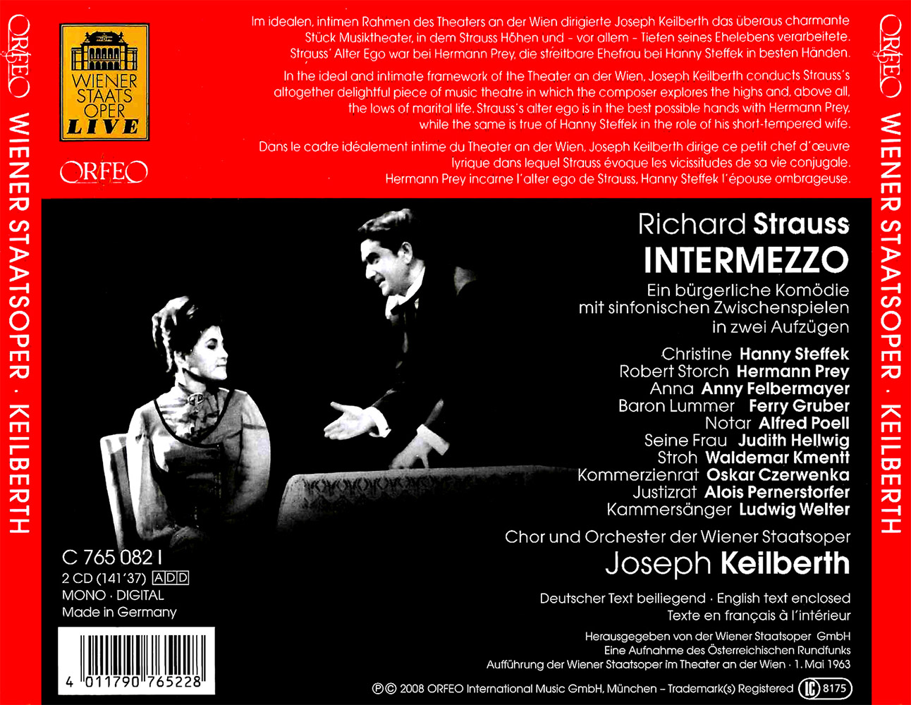 If singers loved working with Joseph Keilberth, it was because he brought to all his opera performances a deep knowledge of the work in question, a stick technique that left them in no doubt as to his intentions and a highly considerate musical sensitivity. Even in luxuriantly scored works he never lost his ability to ensure a perfect balance between stage and pit. These were ideal conditions for a work like Richard Strauss’s “bourgeois comedy”, Intermezzo, for which the composer wrote his own libretto – only the second time that he had done so since the failure of his first opera, Guntram, thirty years earlier. The work harks back to the start of Strauss’s career in other ways, too, notably in the affinity between the opera’s orchestral interludes and the composer’s early tone poems. In his depiction of a marital row between Court Kapellmeister Robert Storch and his wife, Strauss did not even fight shy of ironic allusions to his own connubial domesticity. The Vienna State Opera mounted a new production of this rarely heard work at the Theater an der Wien in 1963, when Keilberth and the Vienna State Opera Orchestra had at their disposal a team of singers who, thanks to their excellent diction and acting skills, were able to capture the conversational tone that is required but which is so difficult to achieve. Leading the ensemble is Hanny Steffek as the Kapellmeister’s wife, Christine. She enjoyed an international career as a Strauss soprano, most notably as Sophie in Der Rosenkavalier, which she sang at Covent Garden under Solti in 1959. Alongside her is Hermann Prey as Storch, a role tailor-made for him both physically and vocally, so much so, indeed, that he was still cutting as fine a figure in the part a quarter of a century later in the composer’s home city of Munich. The two tenors in the 1963 Intermezzo, Waldemar Kmentt and Ferry Gruber, had equally long careers, making their mark in roles that serve initially to fuel the petty jealousies between Storch and his wife before ultimately leaving the coast clear for a suitably harmonious ending.