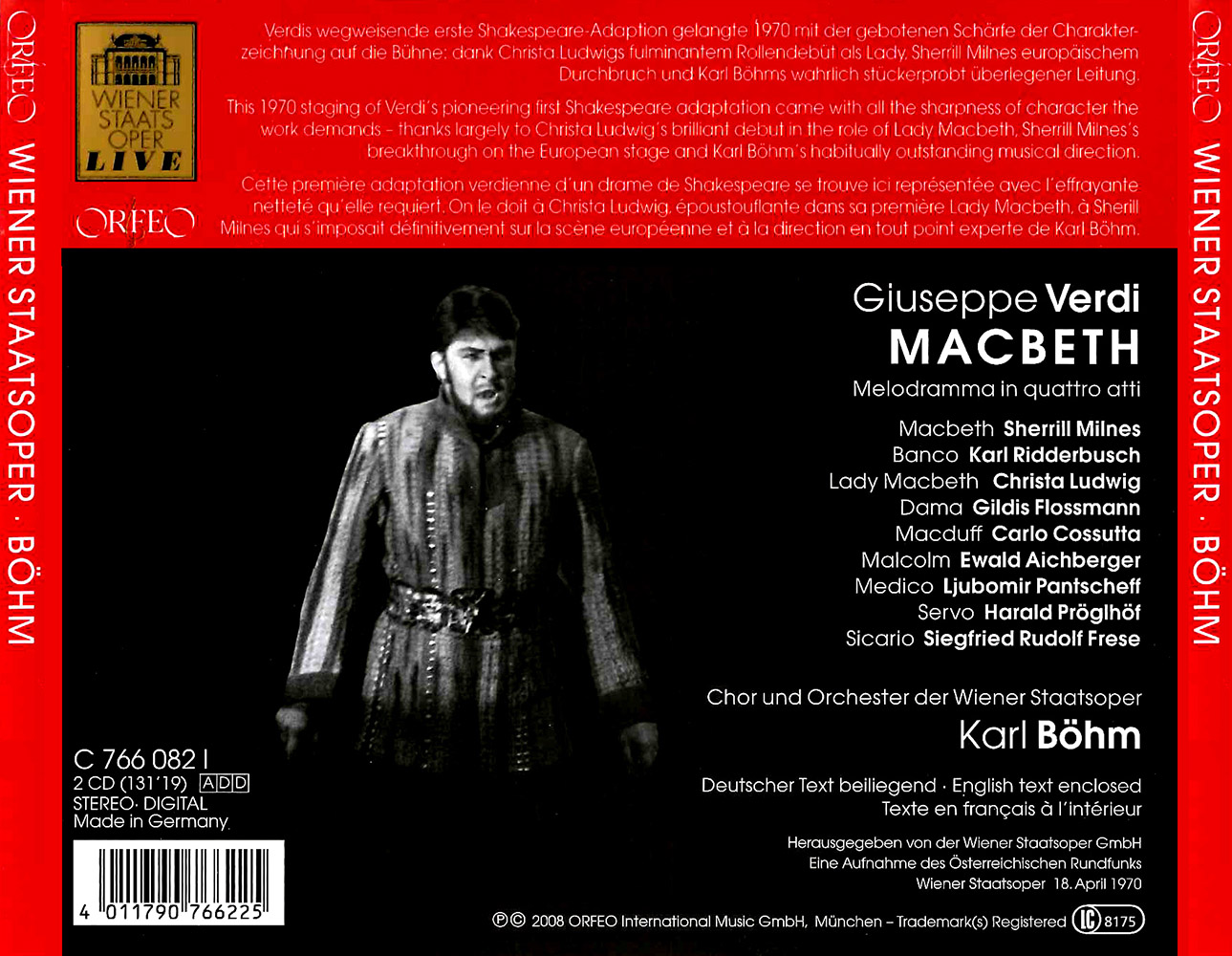Masterpiece though Verdi’s Macbeth undoubtedly is, it was only at a relatively late date that it found a niche for itself in the repertory of the world’s major opera houses. Even today it is difficult to cast the two main roles satisfactorily, but there was no question that this ideal had not been achieved at the Vienna State Opera’s highly successful new production in 1970. Making his house début, the young Sherrill Milnes was also making his first major appearance in Europe, and he immediately impressed his listeners with a voice that was powerful and even throughout its whole range. So profound and lasting was the impression that he left that he soon became a frequent and popular visitor to the State Opera, most notably as Scarpia in Puccini’s Tosca. In the great Apparition Scene in Act Three, in particular, Milnes revealed his ability to create a fully rounded character in his depiction of a man driven by fear and a desire for power. He was partnered by the Lady Macbeth of Christa Ludwig, who at this stage in her career was already a Viennese institution. The role of Lady Macbeth represented both a postscript to, and a turning away from, the hochdramatisch roles that she had essayed during the previous period. Availing herself of her dark-toned timbre and the range of colour of her mezzo-soprano voice, she was able to realize her aim of portraying Lady Macbeth as a seductress who leads Macbeth into a life of crime. In this she received the full support of the conductor, Karl Böhm, who reasserted his claims as a Verdian, claims first aired in the 1940s and 1950s, when he had conducted Macbeth in Vienna with tremendous success. Once again his conducting combined the subtlest of nuances with, where necessary, coarser brushstrokes, so that numbers such as the Conspirators’ Chorus acquire a very real energy in the present live recording, robbing it of all sense of routine. The same is true of the smaller roles, which are cast from strength: as Macduff, Carlo Cossutta – later a distinguished Otello – brings his ringing tenor to music expressive of lamentation and accusation, while avoiding any hint of sentimentality. Karl Ridderbusch’s Banquo, finally, makes it clear why the German bass was in a class of his own in the German repertory.