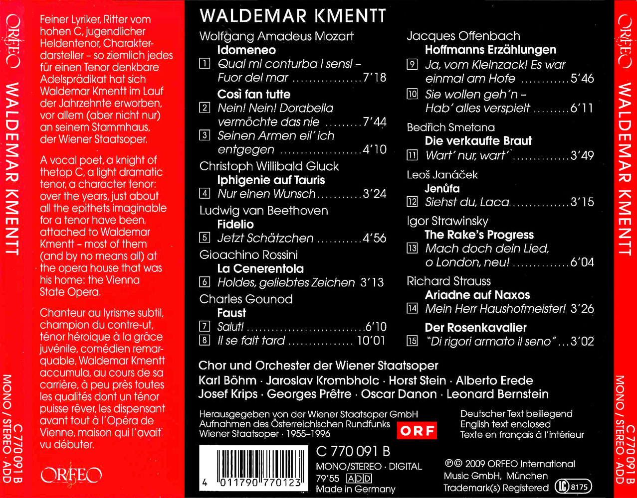 Foto: Fayer, WienThis portrait in honour of his 80th birthday is an impressive reflection of his versatility, with excerpts from roles he performed at the Vienna State Opera, where he was always based, even when travelling for guest performances between Bayreuth and Buenos Aires, and where he received the title of “Kammersänger” and was eventually made an honorary member. The flexibility and brilliant timbre of his voice brought him many roles at the State Opera, both in the legendary Mozart Ensemble under Karl Böhm and as an ‘Italian’ tenor (though, as usual at that time, mostly in German). Thus the portrait includes his Idomeneo and Ferrando in Così fan tutte as well as Don Ramiro in La Cenerentola. Not quite so well-known is the fact that Kmentt increasingly sang the French fach in the 1960s; the excerpt included in the CD is Gounod’s Faust under Georges Prêtre – here in the original language, with Wilma Lipp. His duet with Anja Silja from Offenbach’s Tales of Hoffmann (under Josef Krips) testifies to Kmentt’s exceptional talent as a musical partner. This is also evident in his performance of Janacék’s Jenufa together with Sena Jurinac, as well as in the dialogue with Peter Weber’s Music Master in Strauss’s Ariadne auf Naxos, where, in a 1996 recording of the speaking part of the Major-Domo, Waldemar Kmentt’s precise articulation and vocal skill are clearly audible. Thus it is hardly surprising that even in less frequently performed works such as Gluck’s Iphigenie auf Tauris (Pylade) and Stravinsky’s classicistic The Rake’s Progress, he gave a striking though lyrical portrayal of his characters – and also a brilliant rendering of dreaded short roles such as the Italian tenor in Strauss’s Rosenkavalier at the première of the opera in 1968 under Leonard Bernstein. This aria concludes the cross-section of the prodigious career of a tenor who, ever modest, never relied on mere showmanship.