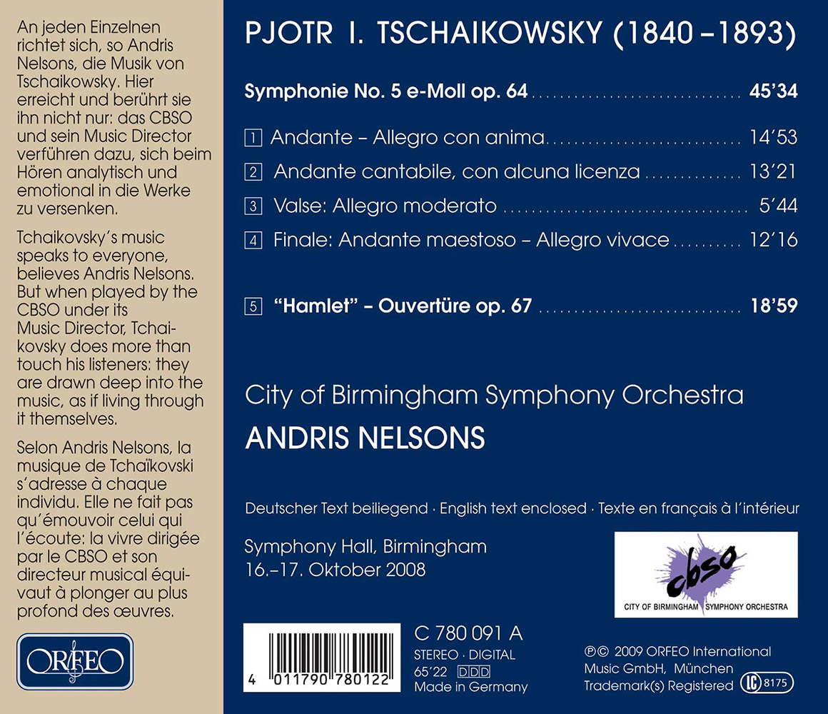 Foto: Marco BorggreveWithin only a few seasons he has created a sensation with many of the most important concert orchestras, from Amsterdam to Philadelphia, as well as at major opera houses such as the Vienna State Opera. On the first ORFEO CD featuring Nelsons with the City of Birmingham Symphony Orchestra, where the young Latvian has been principal conductor since last year, he demonstrates his versatility with Pyotr Il’yichTchaikovsky – notably Symphony No. 5 and the Hamlet Fantasy Overture. Nelson’s “strong sense of architecture and dramatic momentum”, as lauded for example in the Financial Times, shows to full advantage not only in this overture with its wealth of contrast and tone colour. It is readily perceptible that since his youth Andris Nelsons has been influenced and fascinated by Russian music as well as by the overwhelming emotional power and deeply confessional element in Tschaikowsky’s music, which Nelsons sees as personal, in contrast to Beethoven’s and Wagner’s universal message. Nelsons takes the numerous variants of the “Fate” motif in Tchaikovsky’s Fifth Symphony and develops them clearly as stages in a crisis of a genius whose doubts are not completely dispelled, even in the superficially triumphal final march; as subtle nuances they pervade the piece, as amply brought out by Nelsons and the CBSO – both conductor and orchestra fearless in the face of artistic venture. Between the instrumental groups, the phrases in the middle and subsidiary voices are further elaborated with amazing flexibility in the tempi and fine detail, within an apparently unlimited tonal spectrum. Whether strings, woodwinds or brass – throughout all groups, enthusiasm for collaborative music-making with Nelsons is evident; they are all on the same wavelength, fuelled by the same unbridled energy that forms the basis of this promising partnership.