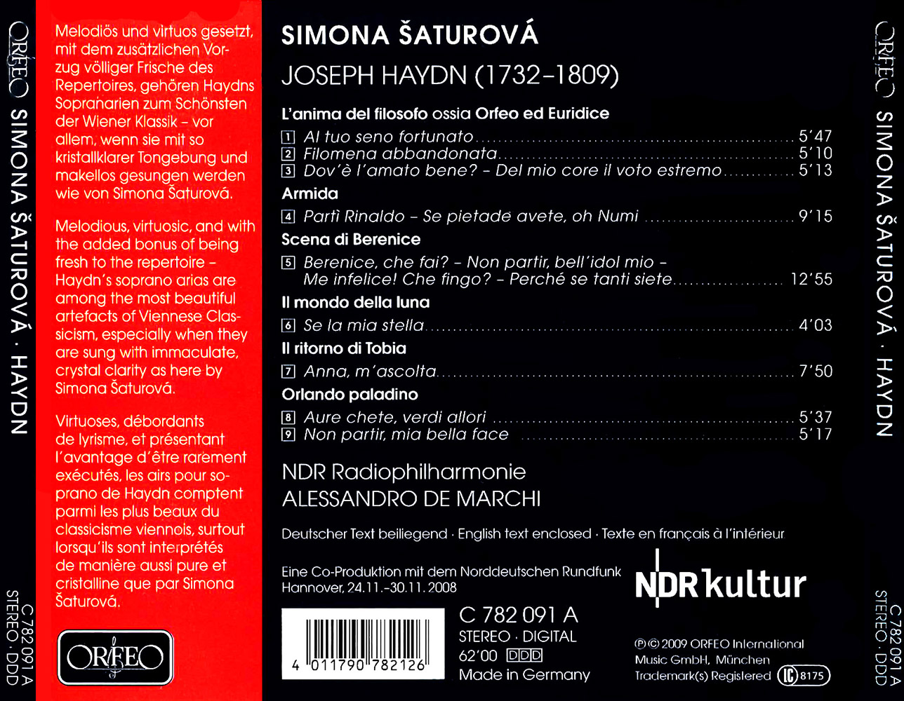 Simona Saturová, with her crystal clear, supremely flexible soprano voice, has already long established herself in the world’s concert halls, working with conductors such as Christoph Eschenbach, Sir Neville Marriner, Jirí Belohlávek and Manfred Honeck. But she has also already enjoyed success on the international operatic stage, beginning in Prague and moving on to Paris, Buenos Aires, Frankfurt and elsewhere. If someone can sing both lyrical and coloratura roles like her, offering vocal warmth and virtuosity in equal measure, then she must be all but predestined to sing to perfection the vocal works of Joseph Haydn, the Viennese classic whose anniversary we commemorate this year. The soprano parts of Haydn’s operas and oratorios are proof enough of the quality of these works, though with the exception of the Creation and the Seasons, they still tend to be regarded askance today. But this is unjustified, as we can easily confirm upon perusing the arias of L’anima del filosofo or Orfeo ed Euridice. These open our CD with Simona Saturová and the NDR Hanover Radio Philharmonic under the baton of Alessandro De Marchi, himself a specialist in the music of the 17th and 18th centuries. Simona Saturová sets alight a veritable firework of coloratura in the aria of the Genius from L’anima, while in those of Euridice, she reveals lyrical simplicity and intensity of expression. An aria from Armida, perhaps Haydn’s best-known opera, offers a synthesis of these performance possibilities. This opera was a highpoint of Haydn’s three decades working as capellmeister at Esterházy Castle. The same flexibility is demanded by the Scena di Berenice, a large-scale dramatic monologue for concert performance that Haydn wrote in London, and whose text was taken from the libretto for Antigono by Pietro Metastasio (a suitable comparison would perhaps be with Beethoven’s soprano aria ‘Ah perfido’). For the ‘world on the moon’ – Il mondo della luna, one of Haydn’s early, cheerful operas for the Esterházy princes – Simona Saturová achieves a light, hovering, charming tone. As in the oratorio Il ritorno di Tobia and the ‘dramma giocoso’ Orlando Paladino, it is the formal structures that strike one here on account of their proximity to Mozart. In both their vocal line and orchestral accompaniment (sung and played with complete command and beauty of tone), Haydn displays no less aplomb. What more could one wish for in a Haydn year?