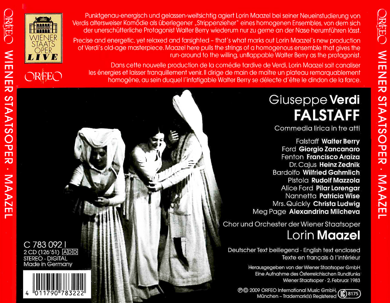 Foto: Wiener Staatsoper/Axel Zeininger(and for that reason is perhaps one that needs several hearings in order to grasp it). It is at once comic and serious, an intimate chamber opera and a large-scale ensemble work, and it draws cleverly on musical tradition while at the same time indulging in near-avant-garde boldness. Falstaff has a long performing history in Vienna (it was first performed there in 1893), and just as long is the list of great conductors who have conducted it at the Vienna State Opera. These include Lorin Maazel, who presented his interpretation of the work there in 1983. He took great pleasure in sending the listener off on the wrong track, only to catch him by surprise again a moment later. No orchestral detail was left out, and yet he always maintained close contact with the stage. For that stage also featured a magnificent ensemble of singers, first and foremost Walter Berry, who in the Indian summer of his career conquered a stellar role for himself once more, this time as fat Sir John. He was equally at home in the joviality of the role and in its ruminative moments as he was in its roguish and impulsive emotional outbursts. The portly knight’s object of desire and his antagonist was Pilar Lorengar as Alice Ford, possessed of vocal luminosity and perfect accentuation. Her jealous husband was played as an unbridled, dashing cavalier by the baritone Giorgio Zancanaro. As the young lovers, the silvery-bright soprano of Patricia Wise and the dark-toned tenor of Francisco Araiza complemented each other charmingly, both in timbre and in the naturalness of their intertwined phrasing. Nor did Christa Ludwig hold back in her renowned interpretation of Mrs Quickly, luring both Walter Berry and the Viennese public to their assignations in Ford’s house and under Herne’s Oak. With an ensemble such as this, the final fugue can truly make us believe that all the world’s a joke – and listening to this live recording merely confirms it.