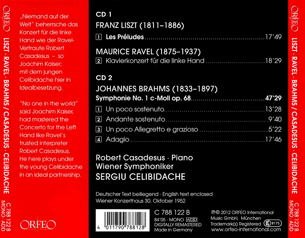 Sergiu Celibidache was one of the most exceptional, unconventional conductors of the 20th century. When Wilhelm Furtwängler was banned from conducting after the Second World War, Celibidache restructured the Berlin Philharmonic Orchestra and conducted it until Furtwängler’s return. But after Furtwängler’s death in 1954 and the subsequent appointment of Herbert von Karajan as his successor, Celibidache’s relations with the orchestra were broken off. Over the ensuing years, up to the moment that he took on the Munich Philharmonic in 1979, Celibidache never tied himself to a single orchestra for any length of time. Instead he led a truly nomadic existence as a restless artist. He seldom travelled to musical centres such as Vienna. His concert with the Vienna Symphony Orchestra from October 1952 that is now being released in its entirety by Orfeo thus offers interesting insights into a time when Celibidache still seemed to be weighing up his options. In Brahms’s First Symphony he comes across as more impulsive, and in the outer movements as more urgent in his tempi, than was the case with the conductor we know from later years and from his later recordings. However, he was already outstanding in his sense of tone colour and in his ability to get his orchestral musicians truly to listen to one another. This is evident in Les Préludes by Franz Liszt at the beginning of the concert, and above all in the Concerto for the Left Hand by Maurice Ravel, whose solo part is played by none other than Robert Casadesus. With his sense of pianistic refinement, French clarity and aristocratic command, it was not surprising that Casadesus became the interpreter of this work. In his collaboration with the Vienna Symphony Orchestra under Sergiu Celibidache, he succeeded in exemplary fashion in maintaining the tension throughout that is characteristic of this concerto, and in making the most of the grotesque nature of many of its episodes. This is a fascinating encounter between two great musicians.