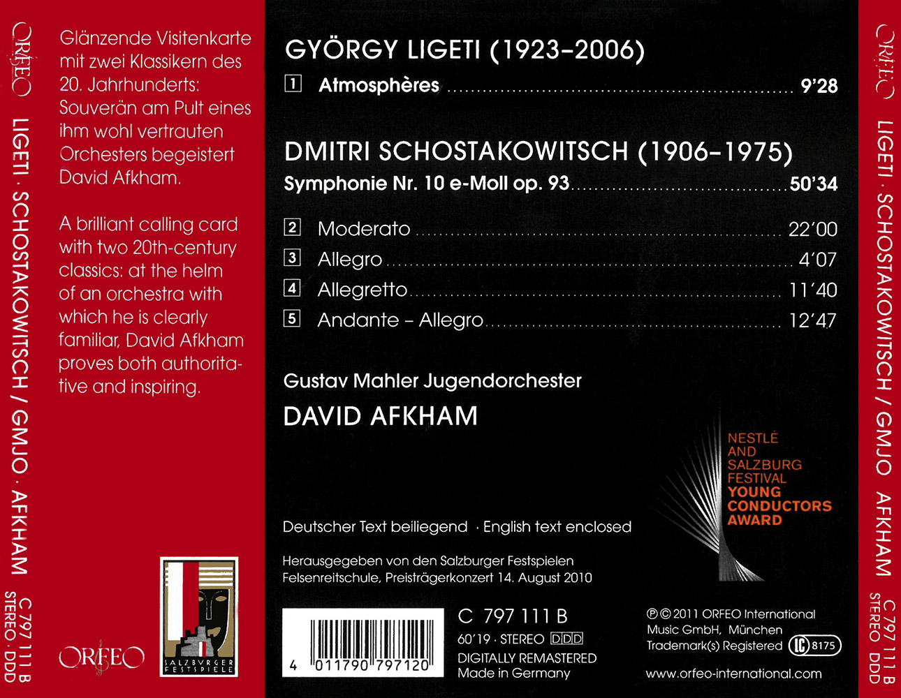 Foto: WildbildIt was with two 20th-century classics that he shone in Salzburg in 2010: György Ligeti's Atmosphères for large orchestra and Shostakovich's Tenth Symphony in E minor op. 93. It is clear from the present live recording of the first of these pieces with the Gustav Mahler Youth Orchestra that David Afkham's ability to handle the work's wide range of sonorities is second to none. Ligeti's divides up the orchestral voices in extremely varied ways, achieving a multi-dimensionality that finds perfect expression in David Afkham's performance, whether in denser or lighter textures. With its sense of turmoil and lamentation and its climactic, if ambiguous, mood of celebration, Shostakovich's Tenth Symphony dates from the years of the political “thaw” in the Soviet Union. David Afkham's interpretation is notable for its overview and for its sense of moderation with no hankering after empty effects. That his realization of this programme is so well thought through augurs well for the future and makes one doubly curious to see how his career will develop as a conductor.