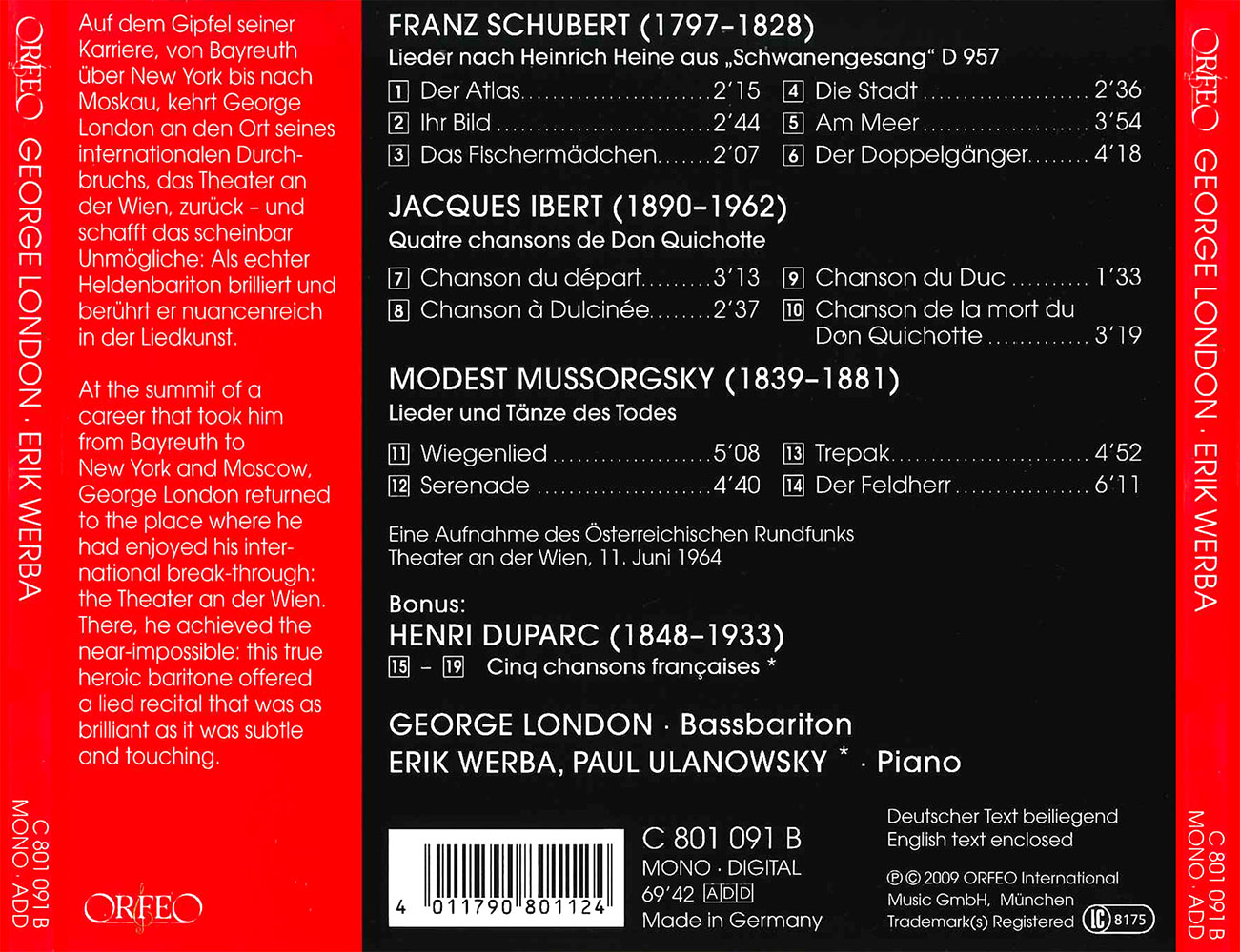 In tune with the spirit of the place, London began his recital with the Heine songs from Schubert’s Schwanengesang, in which he could explore (but not exceed) the dramatic boundaries of songs such as Atlas and Doppelgänger. As Boris Godunov, London travelled the world – from the Bolshoi in Moscow to the New York Met – but in this recital, too, he wandered in the footsteps of Feodor Chaliapin by singing Jacques Ibert’s Iberian-influenced Don Quichotte and finally Modest Mussorgski’s Songs and Dances of Death – tone paintings of archaic grandeur in which he was wholly in his element. In all three cycles, Erik Werba as accompanist completely lived up to his reputation as a modest, but equal partner. In addition to this live recording from Austrian Radio, ORFEO here offers as a bonus the five songs by Henri Duparc with which George London had ten years earlier made his lieder debut before a microphone, in Canada, the country of his birth.