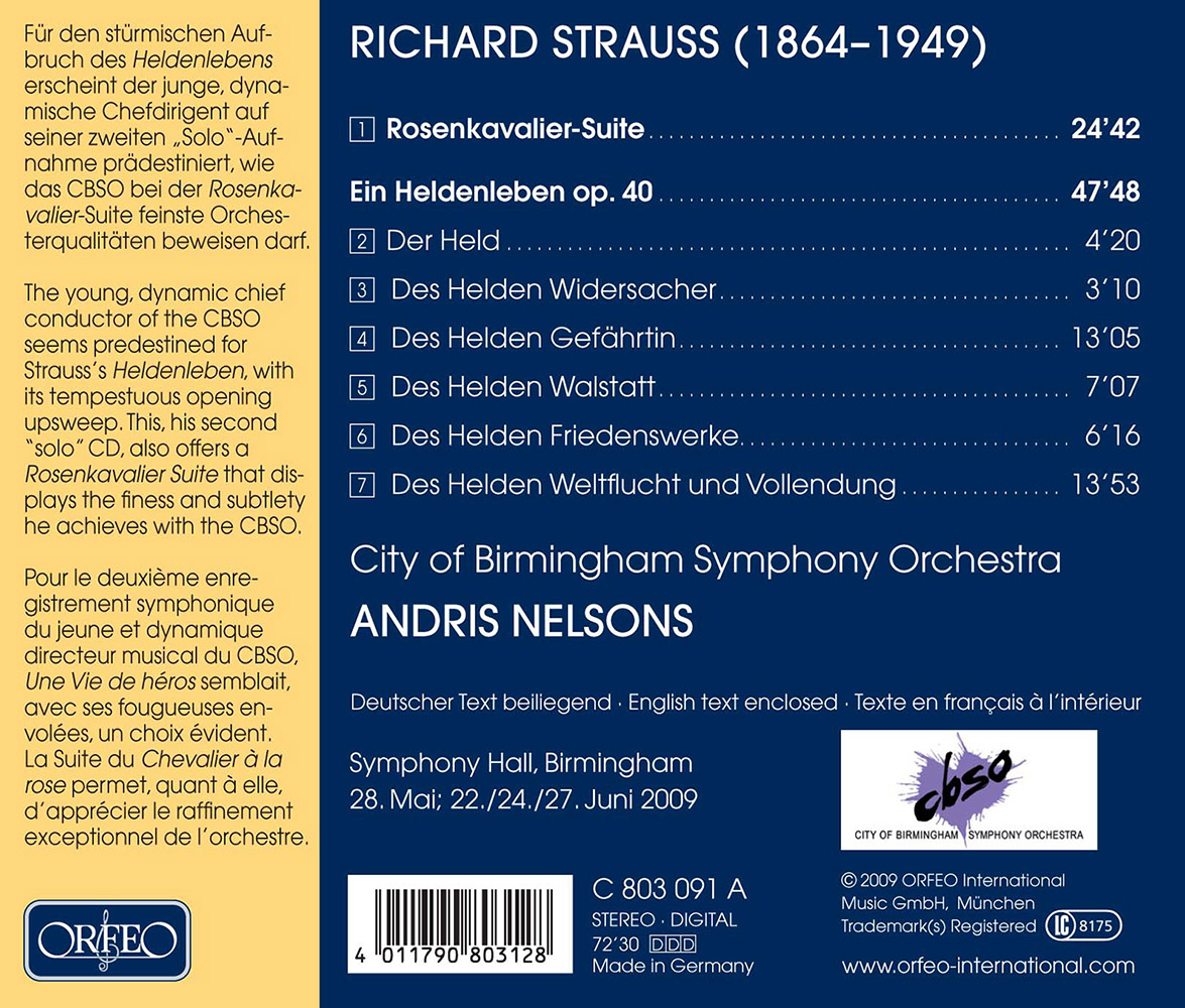 For all its undoubted brilliance, Ein Heldenleben – especially at a first hearing – remains one of Strauss’s most problematical tone poems. Dating from the dying moments of the nineteenth century, it is notable for the late Romantic exuberance of its opening; for the tonally extremely free motifs associated with what are described in the musical programme as the hero’s enemies; for the sweetness and the capers on the solo violin and in the orchestra that characterize the hero’s “companion”; and for the subsequent martial and transfiguring stages in the musical argument. And yet all of this can easily give the impression that the work carries an excessive amount of often autobiographical baggage. What the piece needs is not only a first-class orchestra but also a conductor with a clear sense of the work’s underlying structure, a conductor, moreover, who is able to maintain the tension and respond quickly and consistently to the work’s countless details. This is certainly how Andris Nelsons sees his task, a task that he realizes magnificently in this, his second Orfeo recording with the City of Birmingham Symphony Orchestra. The orchestra and its music director allow the orchestral colours to gleam and ensure that the individual sections that make up the score flow smoothly, sweeping the listener along with them. From start to finish this reading of Ein Heldenleben has such a stringency and rigour that many of the aesthetic objections to the work merely add to our pleasure at individual details, while never calling into question the piece’s overall design. The fact that Nelsons is also a master of the art of transition in the music theatre and can achieve this on the concert platform, too, is clear from his recording of the Suite from Der Rosenkavalier. For listeners familiar with what is arguably the 20th century’s best-known “comedy for music”, the episodes and high points that make up this suite may seem to be no more than paratactically juxtaposed, but under Nelsons’ direction they merge together to create an impression that strikes even the first-time listener as spontaneously compelling and coherent. If Ein Heldenleben runs the risk of luring interpreters in one particular direction before an unexpected turn of events leads them off in another, then this stratagem turns out to be the guiding principle in the Suite from Der Rosenkavalier, providing listeners with delightful surprises and catching them unawares, something that Andris Nelsons and his orchestra take evident delight in doing.