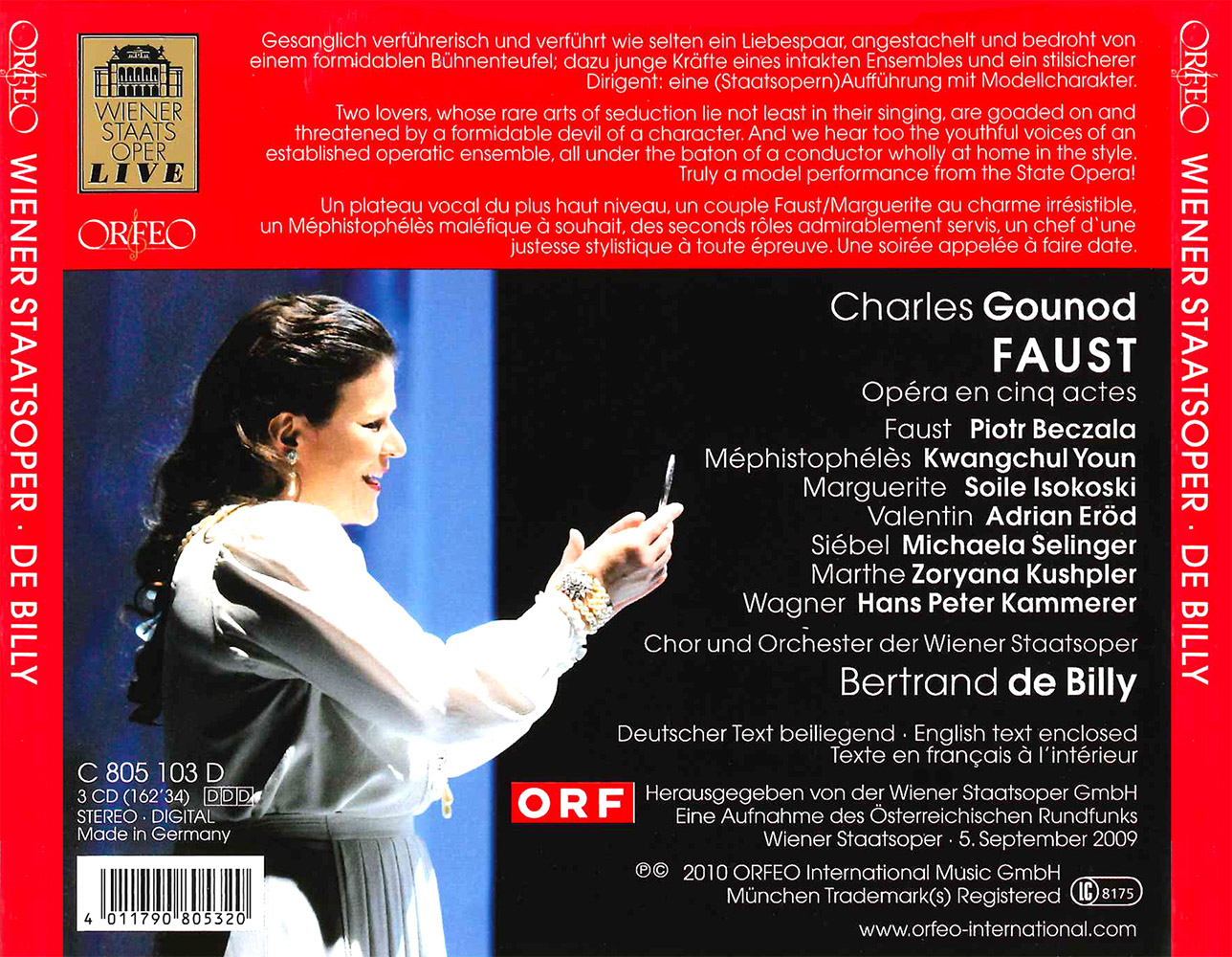 Foto: Wiener Staatsoper GmbH/Axel ZeiningerThe two protagonists were new to Vienna: Piotr Beczala as Faust and Soile Isokoski as Marguerite. On CD, too, they prove that they were a real stroke of luck, able to combine vocal brilliance with nobility and subtle characterization. The Polish tenor confirmed his reputation as a versatile master of bel canto and a „knight of the high C“, just as the Finnish soprano (who had already enjoyed success at the Vienna State Opera in the title role of Halévy’s La Juive) proves with her finely drawn vocal lines and her well-nigh limitless palette of nuances that she is not just suited to Mozart and Strauss. Nor is it a secret that the mighty bass voice of Kwangchul Youn is not just a Wagnerian giant, for also in the role of Gounod’s devil he can reach the heights of form with remarkable consistency. And with Michaela Selinger and Adrian Eröd as Siebel and Valentin we have documentary proof that for two decades under Iaon Holender, discovering local talent was a matter of course (though by no means something that comes of its own accord). We can hear in compelling fashion how these singers are brought into small, but still important roles as part of their moulding process. And when one hears the precision of the Vienna State Opera Chorus, one can only join in their final chorus of resurrection. No one could here claim that the final judgement has fallen on repertoire theatre; no, it is saved!