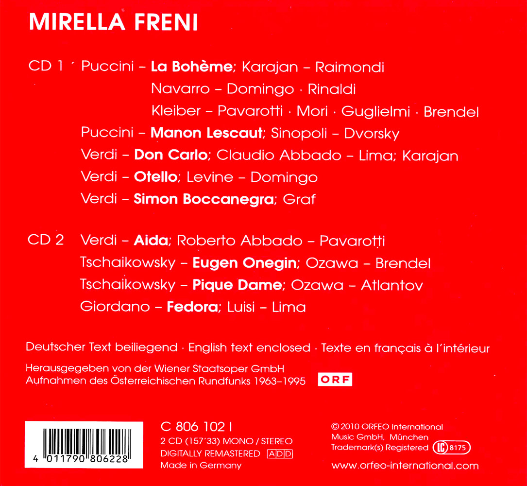 Foto: Foto Fayerwho celebrated her 75th birthday a few weeks ago, is one of the utterly exceptional singers who have emerged from Italy, the home of opera. And unlike those other exceptional talents who crop up every few years (and who, despite their qualities, often disappear again just as quickly), Mirella Freni’s standing is merely heightened by the exceptional length of her career, which was so rich in peaks and free of troughs. That success finds confirmation in the selection of archive recordings on the present CD, chosen from the more than three decades during which Mirella Freni sang at the Vienna State Opera. She began with a sensational debut as Mimì in Puccini’s La Bohème. Within the space of half a year, her Mimì won the public’s heart at both La Scala Milan and in Vienna, each time under Herbert von Karajan. Her Rodolfo at the time was Gianni Raimondi, though the Viennese archives also document her longstanding partnerships with Luciano Pavarotti (under Carlos Kleiber) and Plácido Domingo. It was also with Domingo (under the baton of James Levine) that Mirella Freni repeated at the Vienna State Opera her Salzburg Festival success as Desdemona in Otello. As with her Mimì, her Elisabetta in Verdi’s Don Carlo under Claudio Abbado in 1989 was astonishing, for her voice had lost none of its freshness in the ten years since singing the role under Karajan. In that same decade, she was thus also able to portray with conviction the youthful roles of Amelia in Verdi’s Simon Boccanegra and of Puccini’s Manon Lescaut. Once again at Pavarotti’s side, this time for a Verdi concert in 1990, her public was inspired by her excerpts from Aïda – an unusual role for her. And at this time she also proved with two Tchaikovsky roles that she was more than just a diva in her mother tongue alone. Neither her Tatyana in Eugene Onegin nor her Lisa in Pique Dame (both under the baton of Seiji Ozawa) can be left out of this “Vienna portrait” of her. Nor can her last role at the Vienna State Opera: in singing the title role of Giordano’s Fedora, she joined the ranks of those singers willing to ensure that operatic rarities may return to grace the stage now and then.