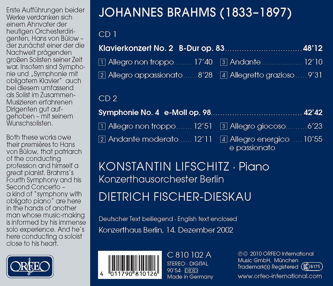 Konstantin Lifschitz is a piano soloist in the Second Piano Concerto who is as thunderingly virtuosic as he is subtly aware of form. And the Fourth Symphony by Brahms offers a marvellous example of how breathing and phrasing is the basis of all common music-making, not least in the symphonic repertoire (and just as much in the concerto here that was in Brahms’ day scolded as being a „symphony with obbligato piano“). Dense agogic and dynamic elaboration and a sense of withdrawn contemplation do not just alternate in this piano concerto, but rather emerge one out of the other. The same is true of the symphony’s formal coherence, from the directness of its opening to its abrupt, almost brusque close. Dietrich Fischer-Dieskau, Konstantin Lifschitz and the Konzerthausorchester Berlin reveal in every moment that musical beauty in Brahms, whether calm or passionate, is always grounded in a consistent musical rhetoric, and that this beauty must be striven for – a process that is as exciting as it is, in the end, mellow and enriching.