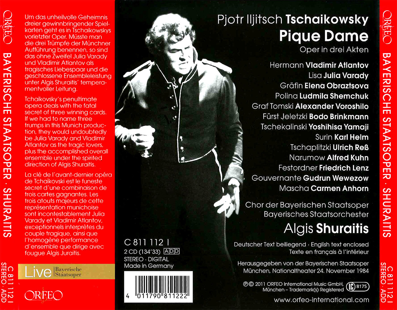 In contrast to Eugene Onegin, Tchaikovsky’s other operas have led something of a shadowy existence in the repertoire. Only his penultimate music drama The Queen of Spades (also after Alexander Pushkin) can claim to look back on a continuous performing tradition in recent decades. In 1984 the Bavarian State Opera saw a production that was musically exemplary in many ways, starting with the role of Lisa, sung by Julia Varady. She had already been celebrated in Munich for her portrayal of Tatyana in Onegin, and here once again she showed herself to be an ideal interpreter for one of Tchaikovsky’s female roles. She savoured the lyrical aspects of the part with the utmost subtlety, while in the tragic plot twist on the banks of the Neva she showed herself a match for its dramatic climaxes. Her vocal portrait of the self-sacrificing young lover Lisa can at last be heard here on CD. Her partner Vladimir Atlantov had to master one of the most murderous tenor roles and did so brilliantly. During the course of his international career, it was above all with Tchaikovsky’s Hermann and with Verdi’s Otello that he truly succeeded in making his mark in a manner that has been remembered long after. There has hardly been another singer able to portray in so gripping a fashion the increasing intensity of Hermann’s passion for Lisa, up to the point of his deadly obsession to win her by means of the “secret of the three cards”. The old Countess is sung by the mezzo-soprano Elena Obraztsova, like him another of the great voices from the former Soviet Union. They were joined by several further compatriots: Polina was sung luxuriantly by Ludmila Shemchuk, Count Tomsky by Alexander Voroshilo, and last but not least Algis Shuraitis was at the helm of the Bavarian State Opera to ensure that their joint efforts were crowned by the creation of an idiomatic cast for this production of The Queen of Spades. The ensemble, chorus and orchestra of the Bavarian State Opera contributed above and beyond the call of duty to the success of it all, playing and singing with fire and verve, and they well deserve an honourable mention here.
