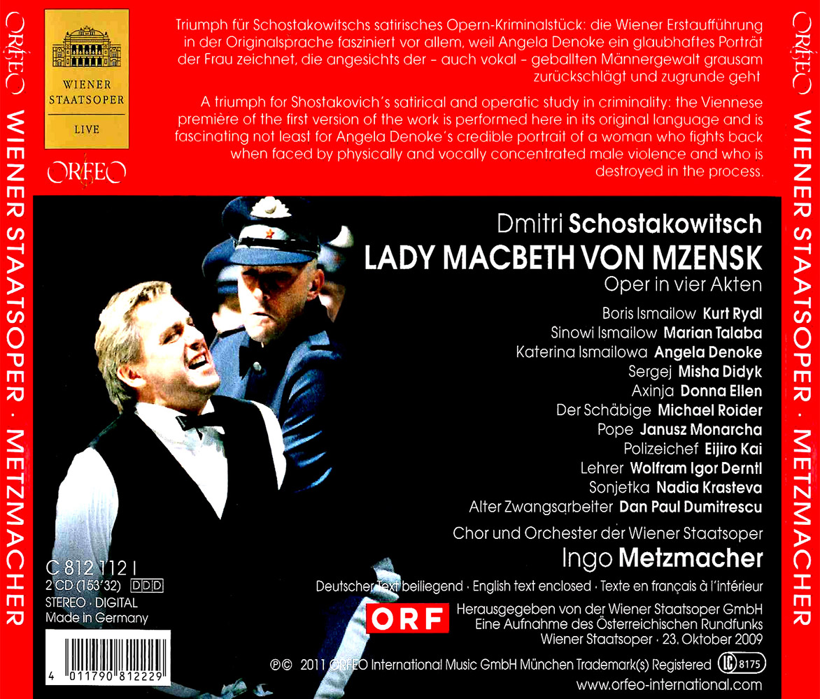 It took a long time for the Vienna State Opera to get round to mounting a production of the first version of Shostakovich's Lady Macbeth of the Mtsensk District. One of the key works of the 20th century, the opera finally entered the Vienna State Opera repertory in 2009 in its original language and with none of the sanitizing changes that Shostakovich had made to the score in the wake of Stalin's death and of the life-threatening reproaches levelled at the work by the Soviet Communist Party. The plot remains as explosively provocative as ever, with its account of the murderous goings-on of a frustrated merchant's wife in Tsarist Russia and a musical setting that veers virtuosically between biting social satire and sympathy for the protagonist. It was all the more important, then, that the Vienna State Opera was able to enlist the services of an experienced conductor and draw on its own home-grown ensemble led by a singing actress of thrilling intensity: on CD, too, Angela Denoke is fascinating as Katerina Izmaylova, her singing marked by its razor-sharp accuracy and highly individual timbre, her acting making her atrocities at least understandable if not forgivable. In order for the opera to create this impression, it also needs powerful antagonists, which it found in the form of the young heldentenor Marian Talaba as Katerina's duped husband Zinovy and the black bass of Kurt Rydl, who lends a chilling stature to Katerina's violent stepfather Boris. Or take Nadia Krasteva, whose richly coloured mezzo-soprano helps to flesh out the character of Katerina's rival, Sonetka, who appears in the column of convicts in the opera's harrowing final scene. Here Katerina's seducer and lover, Sergey, turns out to be a false friend and, as such, a foil to the protagonist. Making his State Opera début, Misha Didyk used his lyrically and dramatically flexible tenor to create a portrait against which the dark and unfathomable facets of Angela Denoke's portrayal could stand out even more clearly and impressively. The numerous smaller parts, together with the chorus and orchestra of the Vienna State Opera, were inspired by Ingo Metzmacher's conducting to produce an interpretation that explored every aspect of Shostakovich's score, a score teeming with the greatest extremes of tempo, dynamics and rhythm.