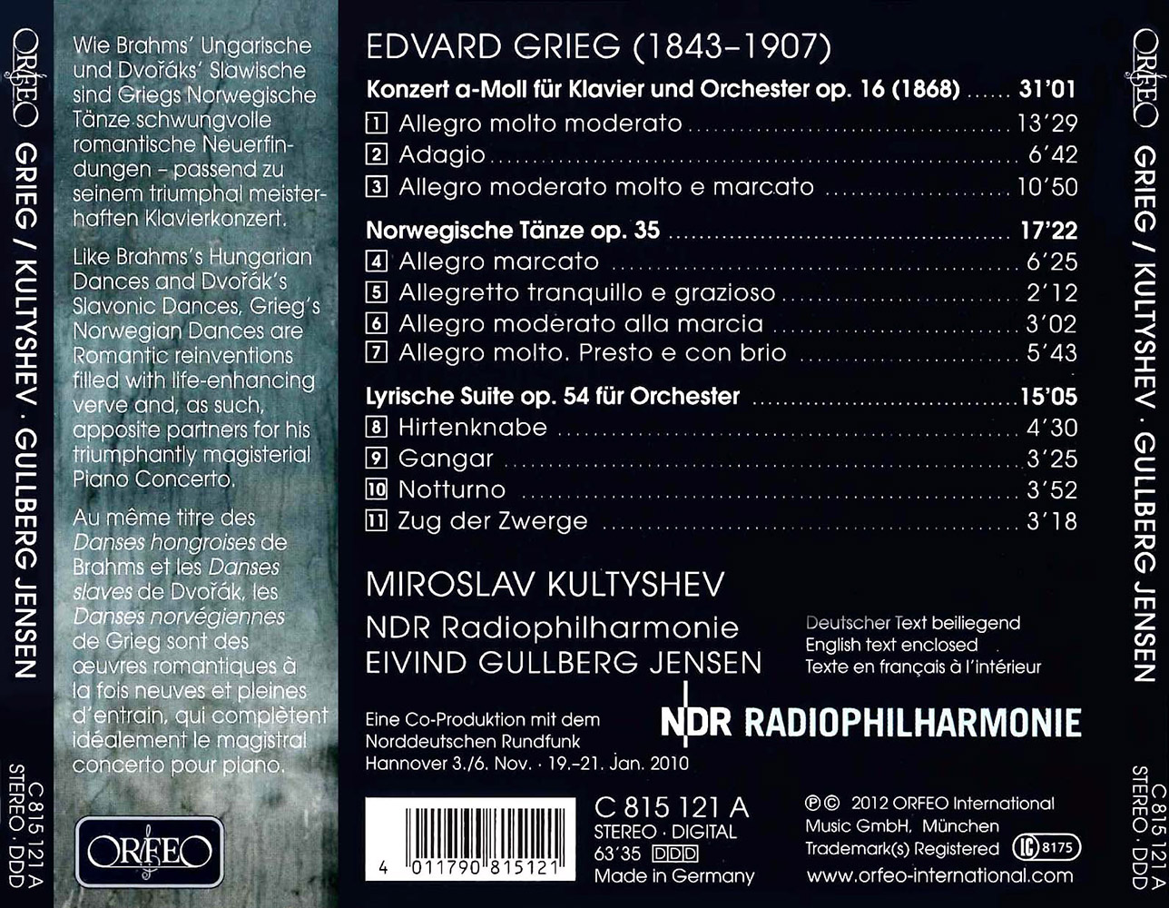 It makes good sense for the young Russian piano virtuoso Miroslav Kultyshev to follow up his Orfeo recording of Liszt’s Études d’exécution transcendante with Grieg’s A minor Piano Concerto op. 16, a work with which the Norwegian composer took an important first step on the musical stage of his time. Writers are fond of recalling how in 1869, when he was in Rome on a scholarship, Grieg showed the piece to Liszt, who immediately sight-read it and expressed his enthusiasm for the young composer’s abilities and ideas. By this date the work had in fact already enjoyed its triumphant world première in Copenhagen, and since then it has been a permanent presence in all of the world’s great concert halls.