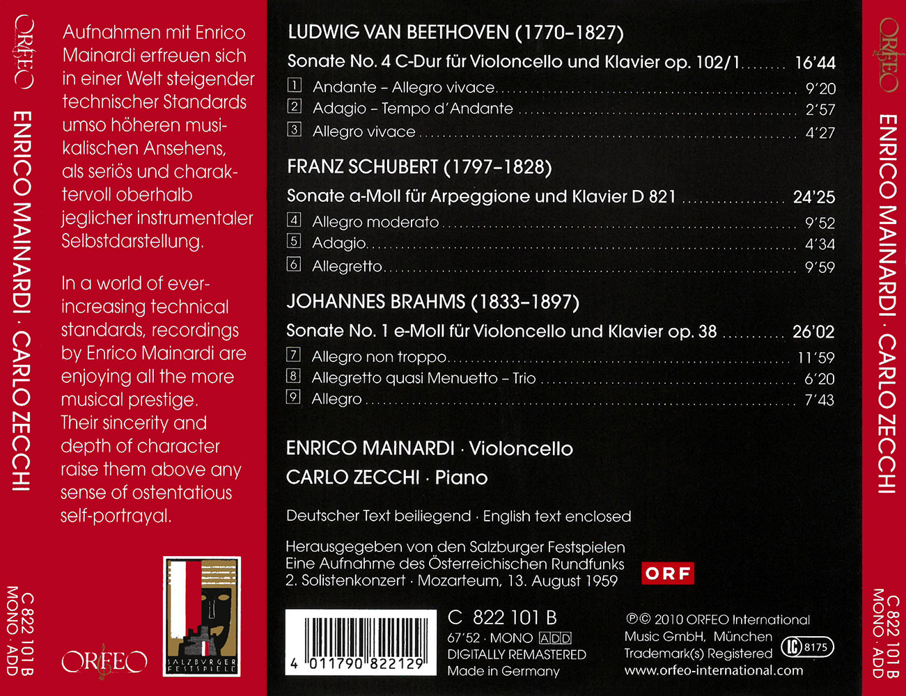 Fischer’s long-time cello partner, Enrico Mainardi, was also almost an institution in Salzburg, both as master and mentor. In a duo with Carlo Zecchi on the piano, he constructed a filigree arch leading from Beethoven’s op. 102 No. 1 via Schubert’s Arpeggione Sonata D 821 to Brahms’s op. 38, demonstrating masterly control and a superior ability to realize the contrapuntal aspects of the give-and-take of ensemble playing.
