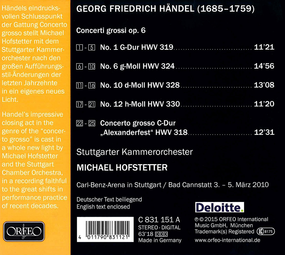 Michael Hofstetter has long been one of the most sought-after conductors in the world. He has a broad repertoire stretching over several different epochs, and in 2015 his invitations range from the Styriarte Graz to the Houston Grand Opera. The Baroque is undoubtedly one of Hofstetter’s main areas of expertise – his affinity for the works of George Frideric Handel has been often proven at venues such as the Handel Festival in Karlsruhe and English National Opera in London. Hofstetter was chief conductor of the Stuttgart Chamber Orchestra from 2006 to 2013, and together they have now recorded Handel’s Concerti grossi Nos. 1, 6, 10 and 12 from his Opus 6 collection, along with the concerto grosso Alexander’s Feast. This last concerto, dating from 1736, was composed while Handel was still lord of the operatic world in London. Nevertheless, it already displays many characteristics familiar from his later concertos, with its sparkling allegro opening, its pastoral Largo, the rich counterpoint of its fugue and its dancelike final movement. Handel’s subsequent concerti grossi offer one highpoint of the genre after another – and the masterful, transparent performances of the Stuttgart Chamber Orchestra under Michael Hofstetter do full justice to this music, from the Musette of Concerto No. 6 – described by Romain Rolland as “one of the most luminous visions of pastoral happiness” – to the French-influenced forms of overture and air in the tenth concerto or the twelfth concerto with its powerful beginning that opens out into supreme elegance and virtuosity. The concerti grossi op. 6 are justly regarded as the highpoint of Handel’s instrumental oeuvre, on a par with Bach’s Well-Tempered Clavier and his Brandenburg Concertos. Handel’s works stand at the end of an era, and he knew how to incorporate aspects of the new “galant” style, moulding highly original works of music out of seemingly incompatible elements and in the process creating an impressive coda to the genre of the Baroque concerto grosso.