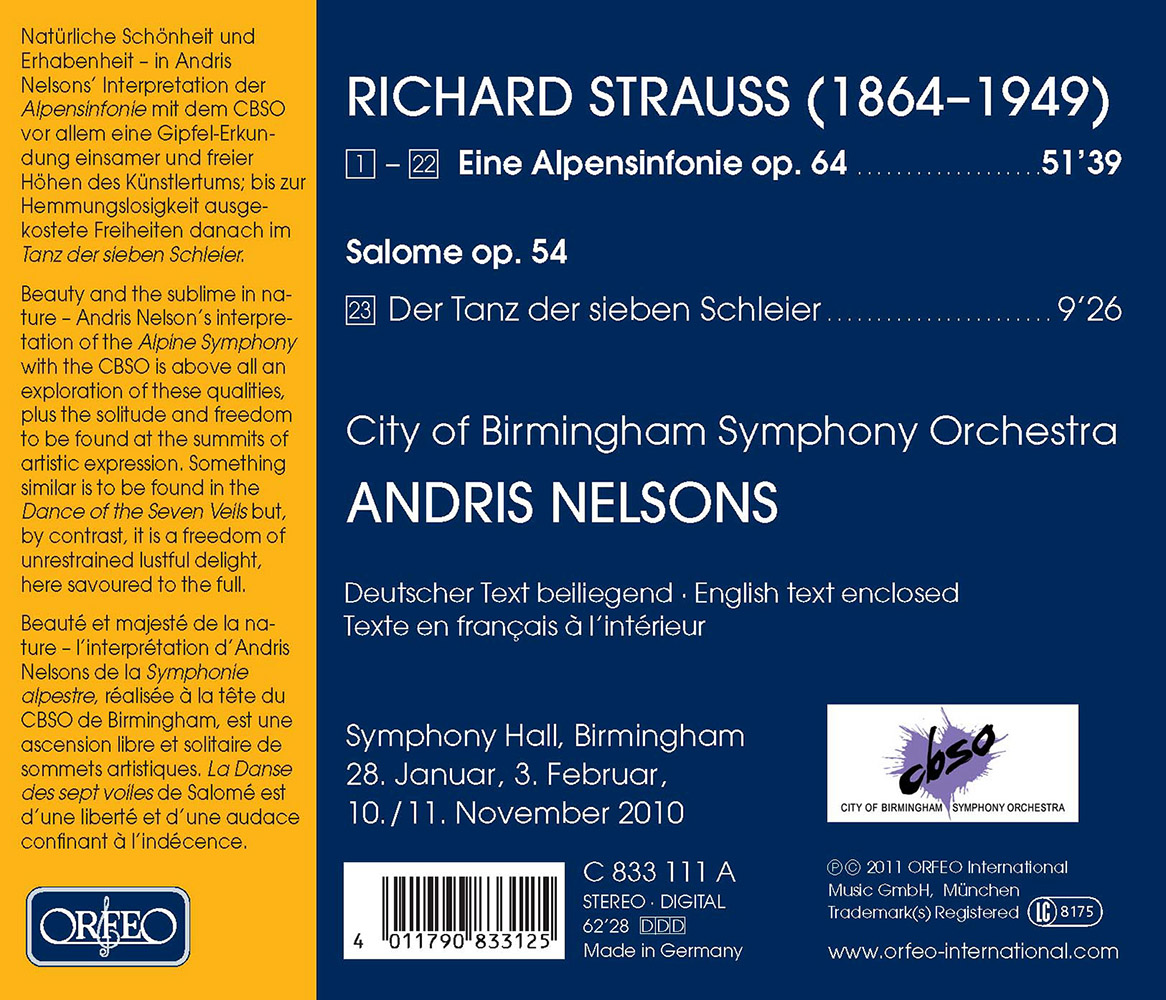 With his Alpine Symphony, Richard Strauss all but invited us to see it as a veritable “summit” in the genre of programme music. It is masterly in its layer upon layer of orchestration (not unlike a mountain massif), while its harmonic and motivic riches offer a sublime acoustic panorama that is gigantic in scope. It is as if the composer has here exhausted the possibilities of the genre. But what if one were to explain this grandiose music aside from Strauss’s own programme, and divorced from his own biography? This is the approach taken by the City of Birmingham Symphony Orchestra under its music director Andris Nelsons. They have already released a highly praised Strauss disc on Orfeo with Ein Heldenleben and the Rosenkavalier Suite, and Nelsons understands how to convey his fascination with Strauss to both the orchestra and his listeners with utter conviction. Musical intoxication is transformed by Nelsons into a flush of freedom – freedom for all, but of the artist in particular. There are naturally also moments of solitude and reflection – as when, for example, Strauss makes thematic allusions to Also sprach Zarathustra (at the “summit” of the Alpine Symphony). Then there is the sense of calm exuded towards the end of the Symphony that is subtly savoured to the full after the storms that marked the descent. Strauss was not just concerned with personal liberty, but was also capable of enthusiastic liberality – as in his opera Salome, which caused such a scandal at the time of its world première. This is made clearly audible in the brilliant encore that the CBSO and Nelsons offer here, namely the “Dance of the Seven Veils”. We rarely hear it so finely tuned and with such unerring accuracy in its orchestral colours and rhythmic density, not to mention the climaxes and shifts in tempi. This “classic” of the early 20th century could hardly be played in a fresher, more contemporary manner.